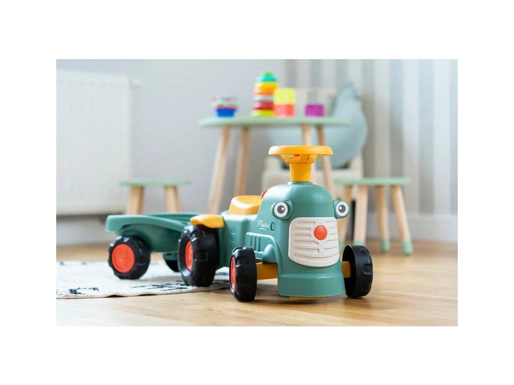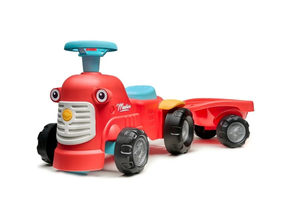 Dětské odrážedlo - Maurice s vlečkou od francouzského výrobce FALK. Odrážedlo má design klasických starých traktorů (Vintage vzhled). Odpojitelná vlečka umožňuje dítěti zábavnou formou převážet věci a hračky. Odrážedlo je vyrobeno z vysoce kvalitního a odolného plastu s ohledem na bezpečnost dětí. Obsahuje otevírací sedátko s úložným prostorem, funkční klakson na volantu a otočnou přední nápravu volantem. Kvalitní nálepky dotvářejí vzhled odrážedla. Pro děti od 1 roku.