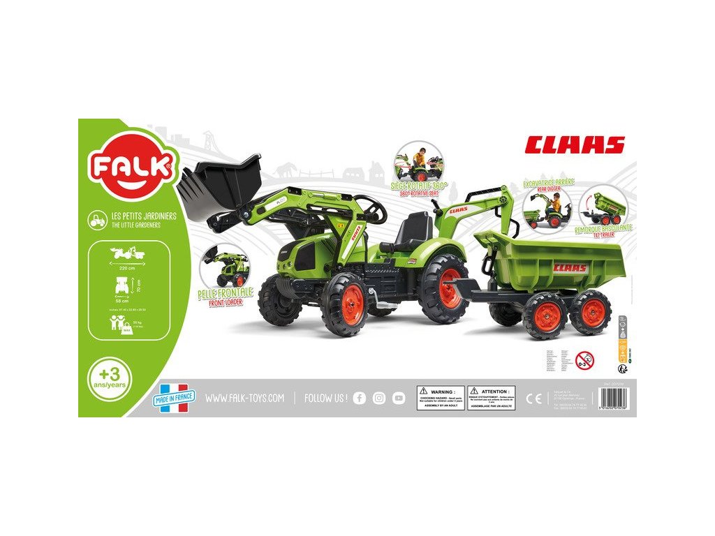 Šlapací traktor pro děti, značky FALK. Replika skutečného traktoru Claas Backhoe. Dětský traktor je vybaven předním nakladačem, rypadlem, Maxi vlečkou, otočným sedadlem a klaksonem pro nekonečné dětské hry. Určeno pro děti od 3 do 7 let.