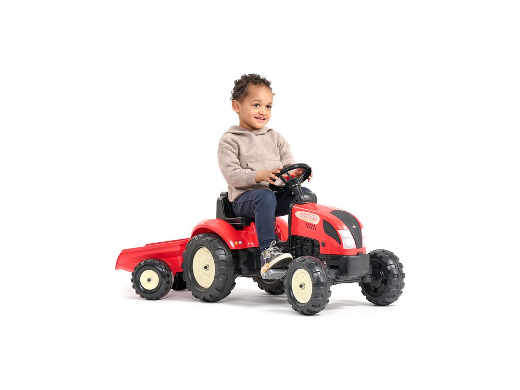 Šlapací traktor s vlečku, kterou lze snadno odpojit a připojit kdykoliv budete chtít, si zamiluje každé dítě. Oje vlečky je k traktoru připojeno pomocí aretačního kolík, který se jednoduše vysune.