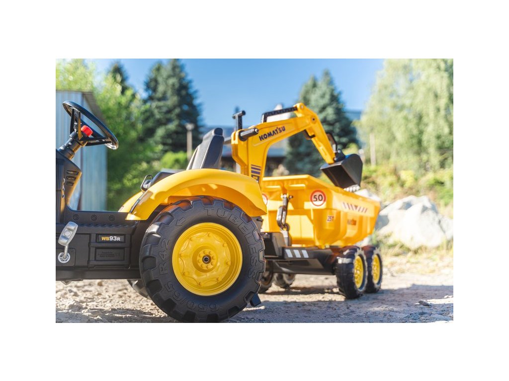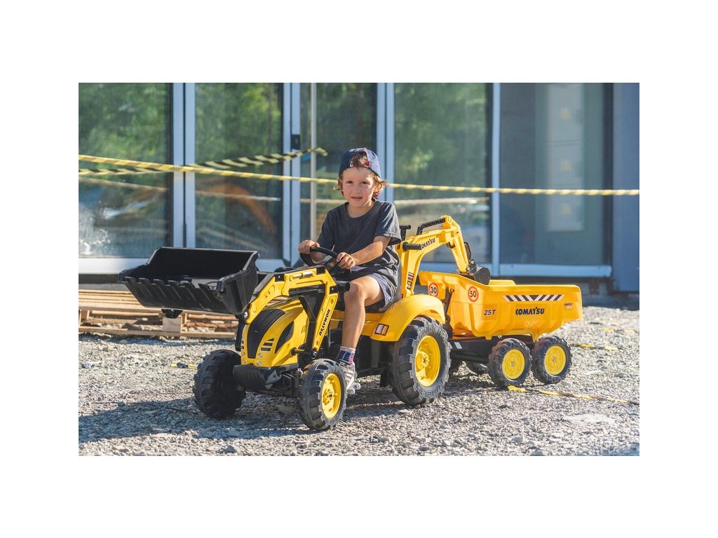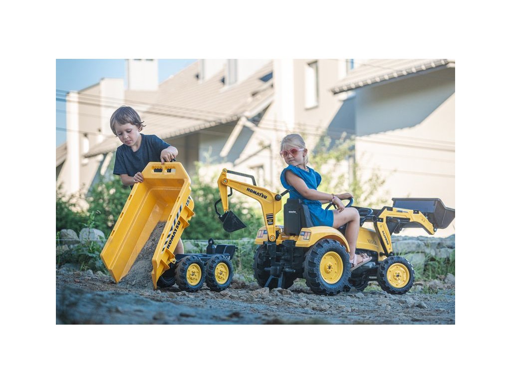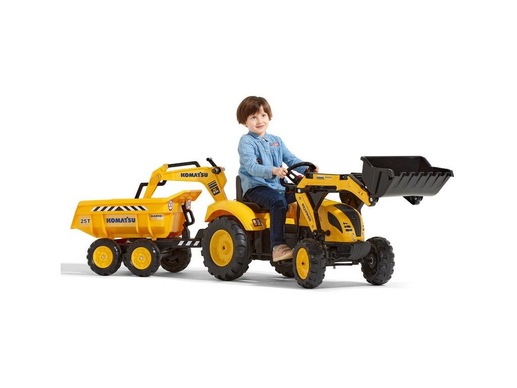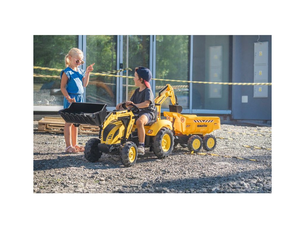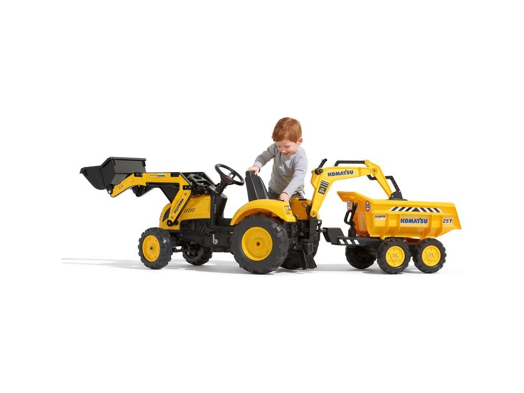FALK - Šlapací traktor Komatsu s nakladačem, rypadlem a výklopnou vlečkou, je replikou skutečného traktoru.