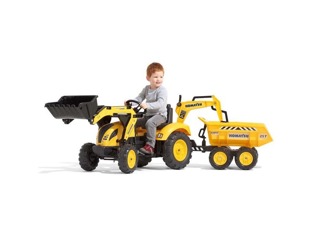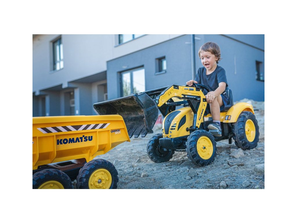 Šlapací traktor pro děti, značky FALK. Replika skutečného traktoru Komatsu . Dětský traktor je vybaven předním nakladačem, rypadlem, Maxi vlečkou, otočným sedadlem a klaksonem pro nekonečné dětské hry. Určeno pro děti od 3 do 7 let.