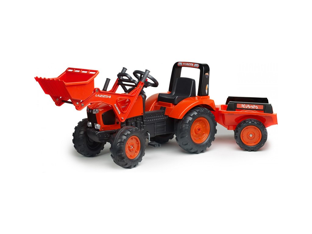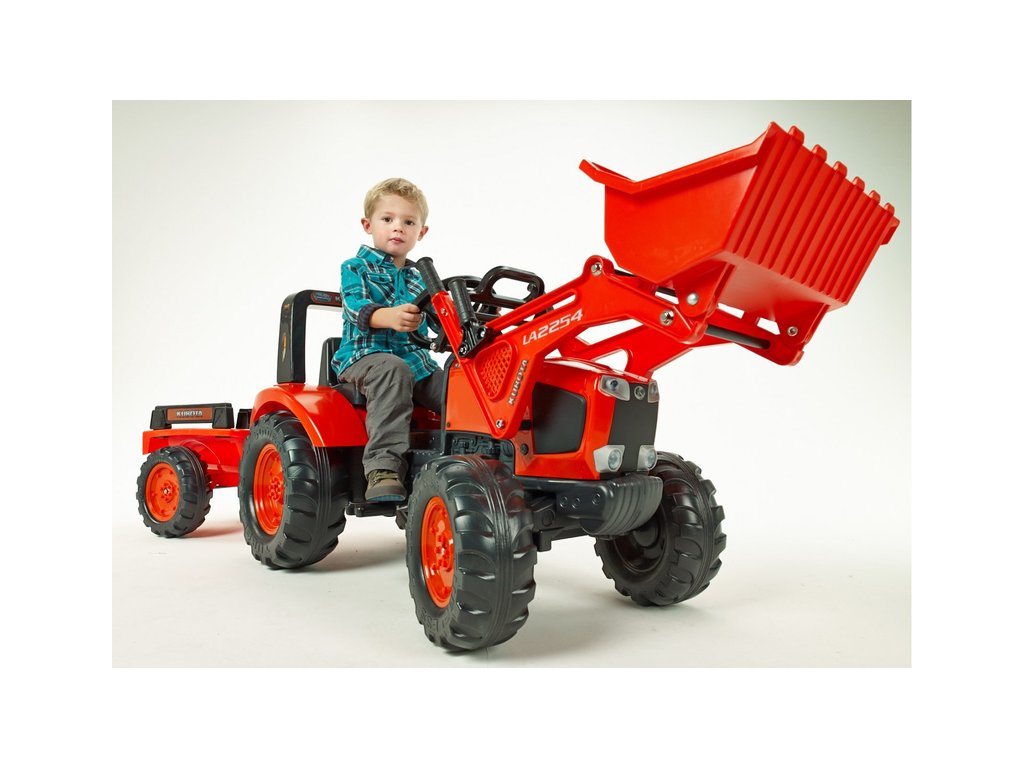 Šlapací traktor Kubota M135GX s předním nakladačem, odpojitelnou vlečkou a funkčním klaksonem. Vhodné pro děti od 3 do 7 let.