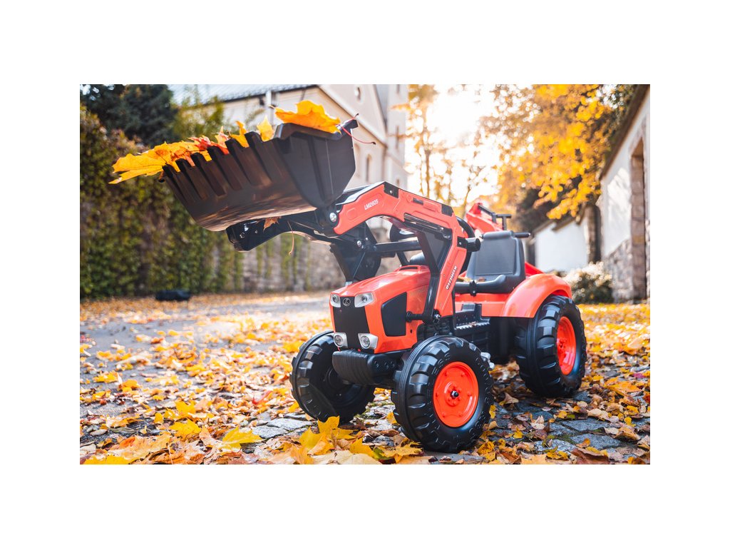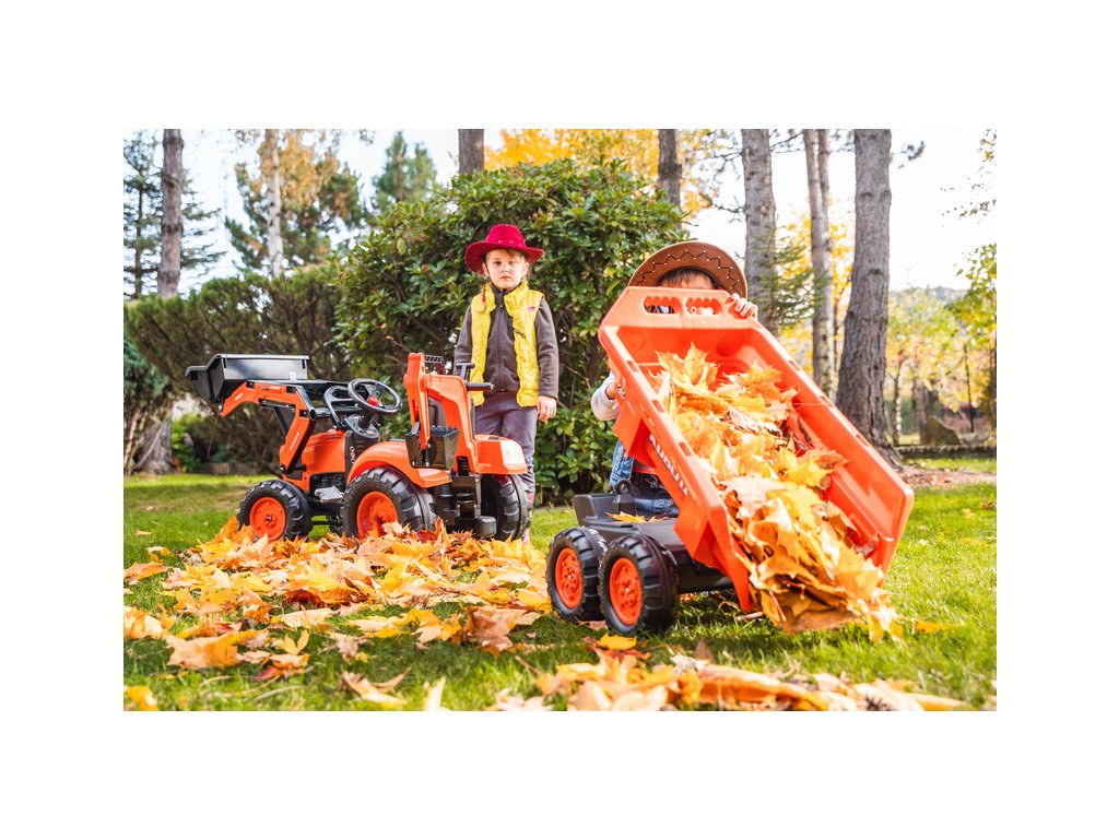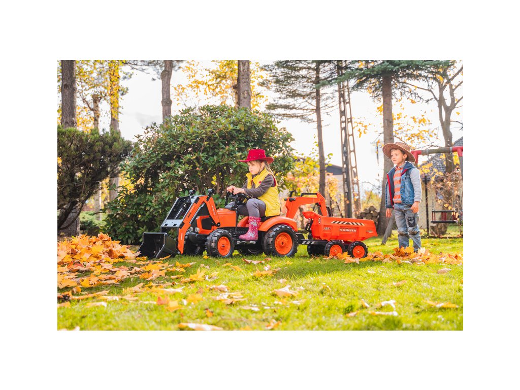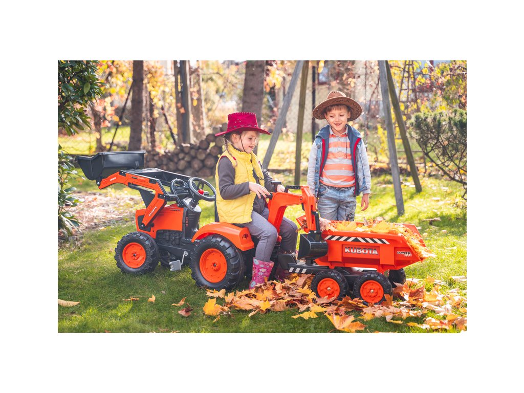 Šlapací traktor pro děti, značky FALK. Replika skutečného traktoru Kubota. Dětský traktor je vybaven předním nakladačem, rypadlem, Maxi vlečkou a klaksonem pro nekonečné dětské hry. Určeno pro děti od 3 do 7 let.