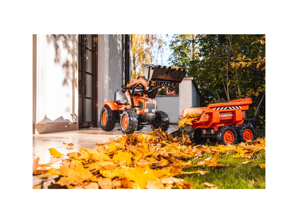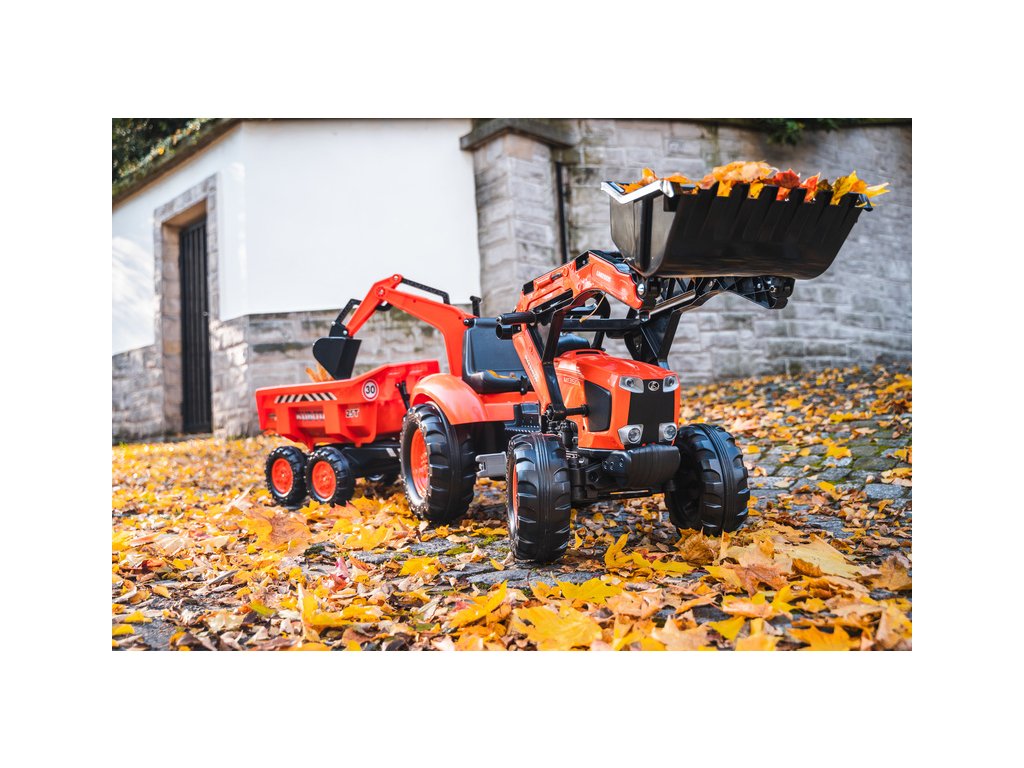 FALK - Šlapací traktor Kubota s nakladačem, rypadlem a výklopnou vlečkou, je replikou skutečného traktoru.