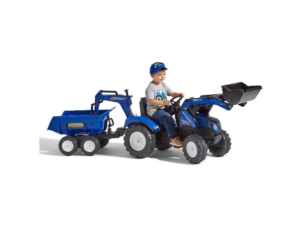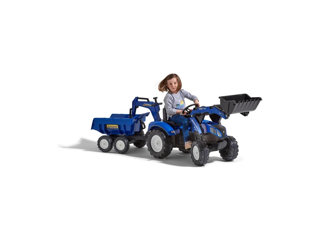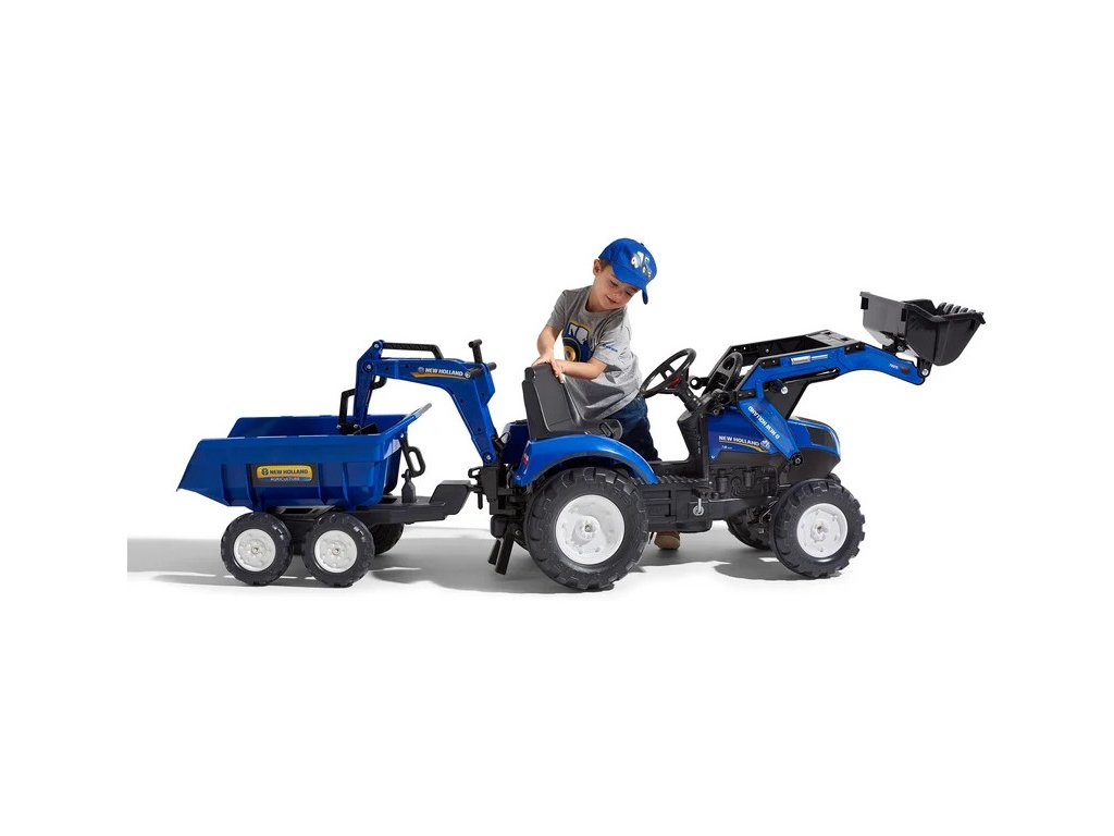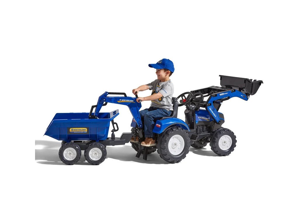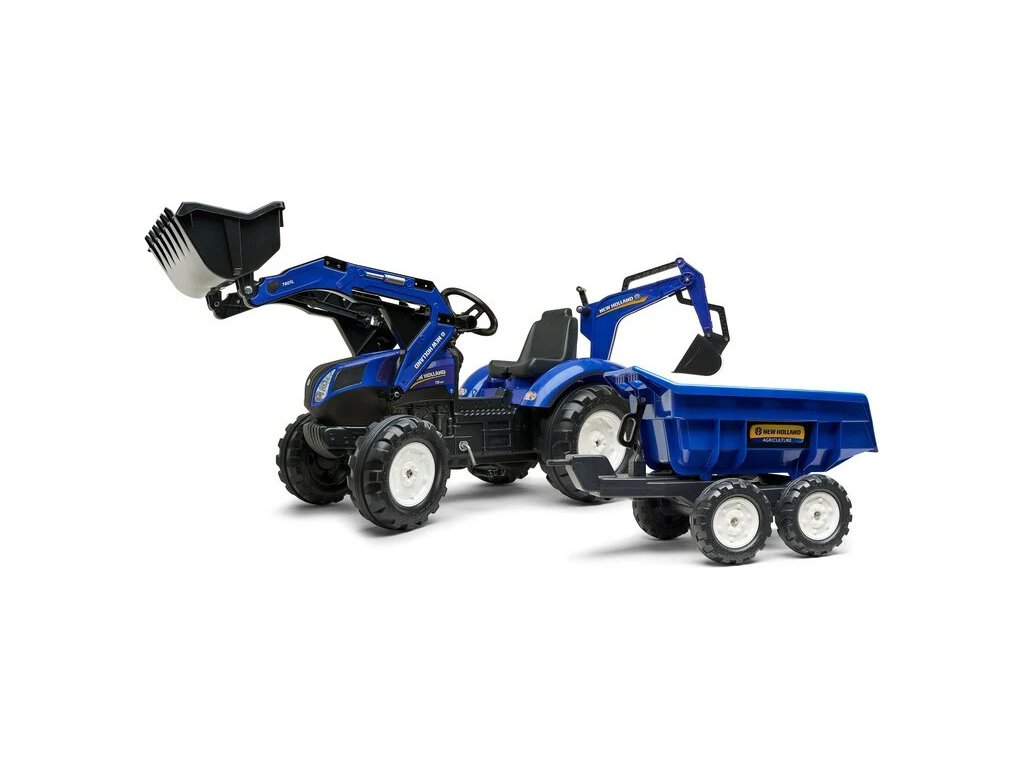FALK - Šlapací traktor New Holland T8 s nakladačem, rypadlem a maxi vlečkou