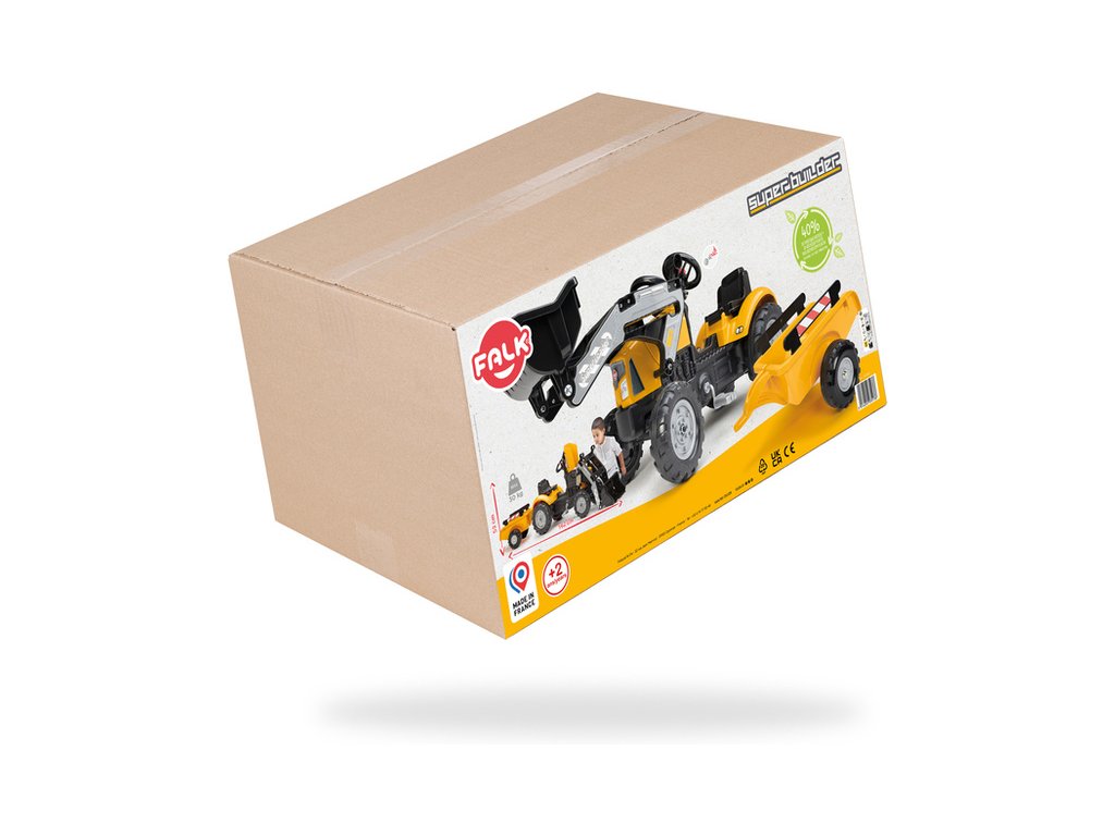 FALK - Šlapací traktor Super Builder s předním nakladačem, odpojitelnou vlečkou, úžasným funkčním klaksonem na volantu a výklopnou kapotou. Vyrobeno ve Francii. Určeno pro děti od 2 do 5 let.