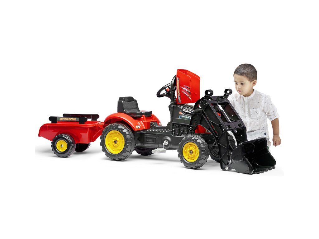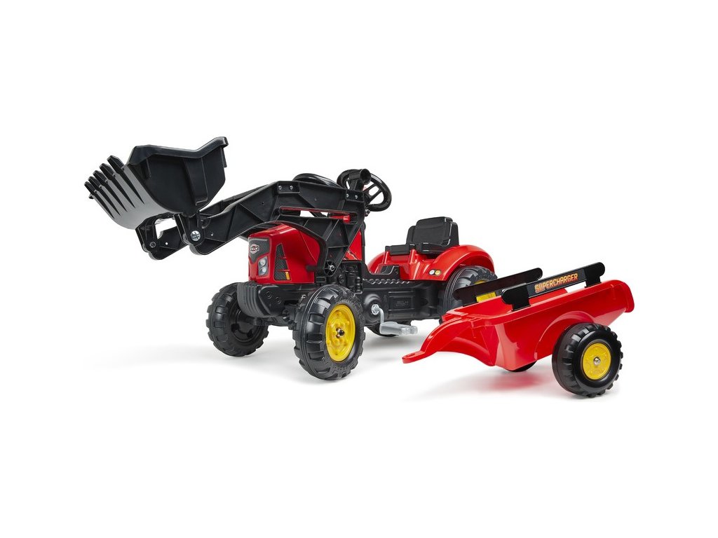 FALK - Šlapací traktor SuperCharger s vlečkou a nakladačem červený