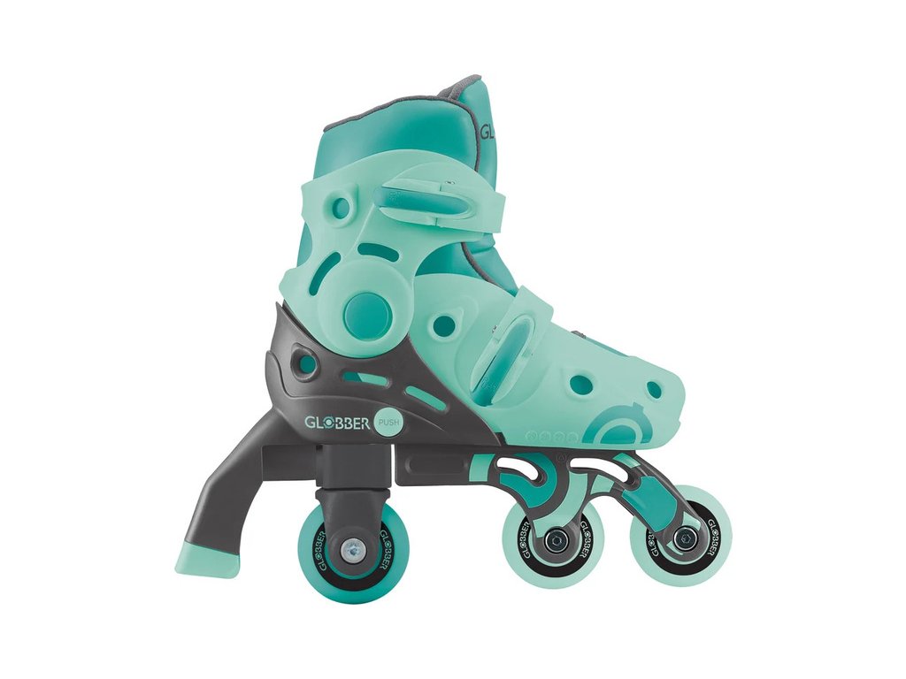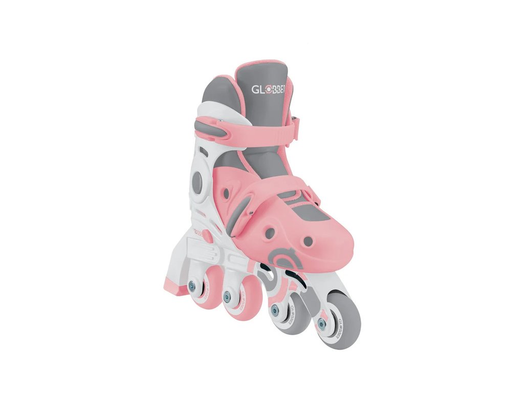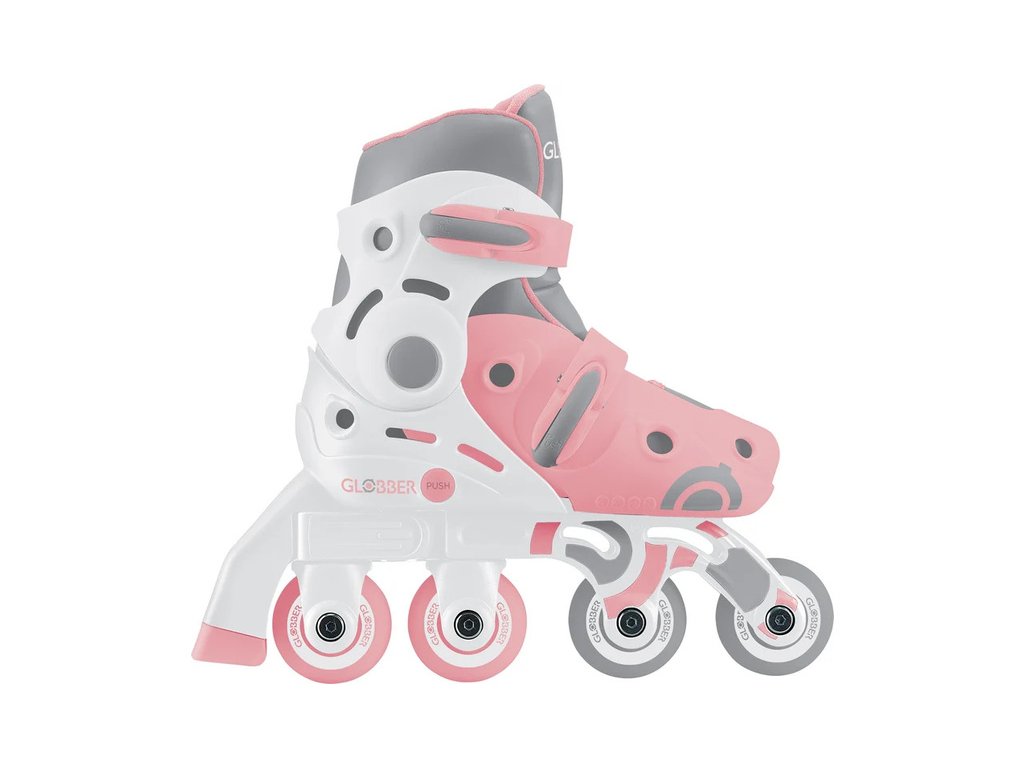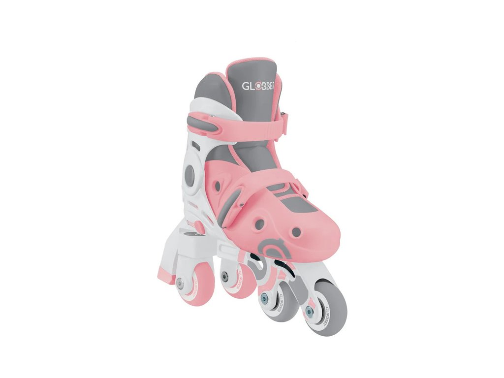 Globber - Dětské kolečkové brusle 2v1, vhodné jako první brusle na učení, díky možnosti jednoduchého otočení zadních koleček, které můžou být vedle sebe pro vyšší stabilitu. Nastavitelné délka boty EU 26-29. Kolečka z PU ø48mm (šířka 24mm). Kvalitní ložiska ABEC 5. Zadní TPR brzda. Přezkové zapínaní.