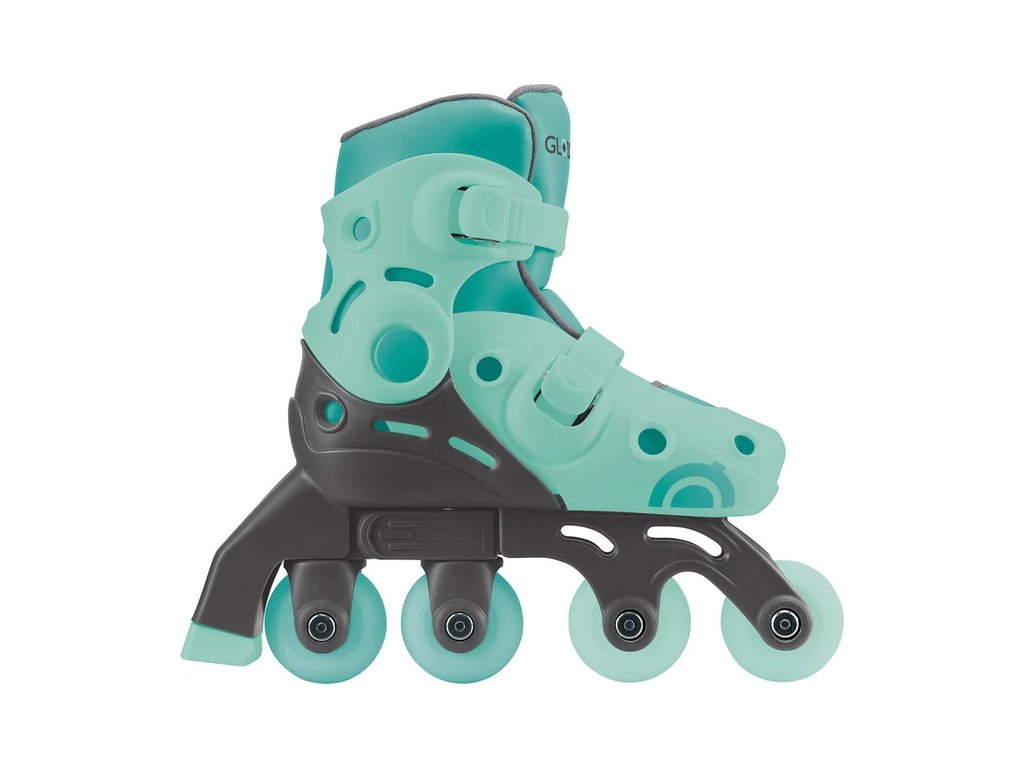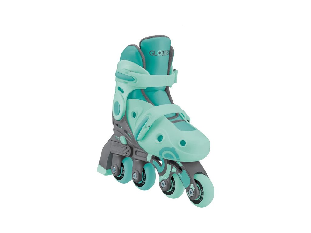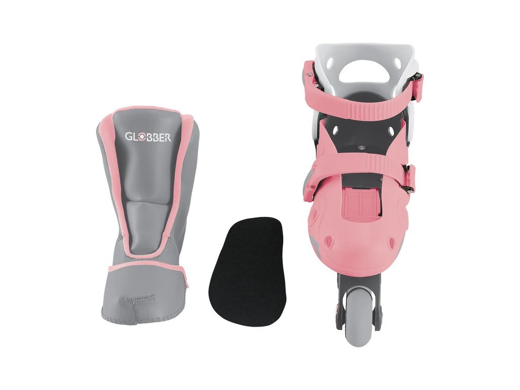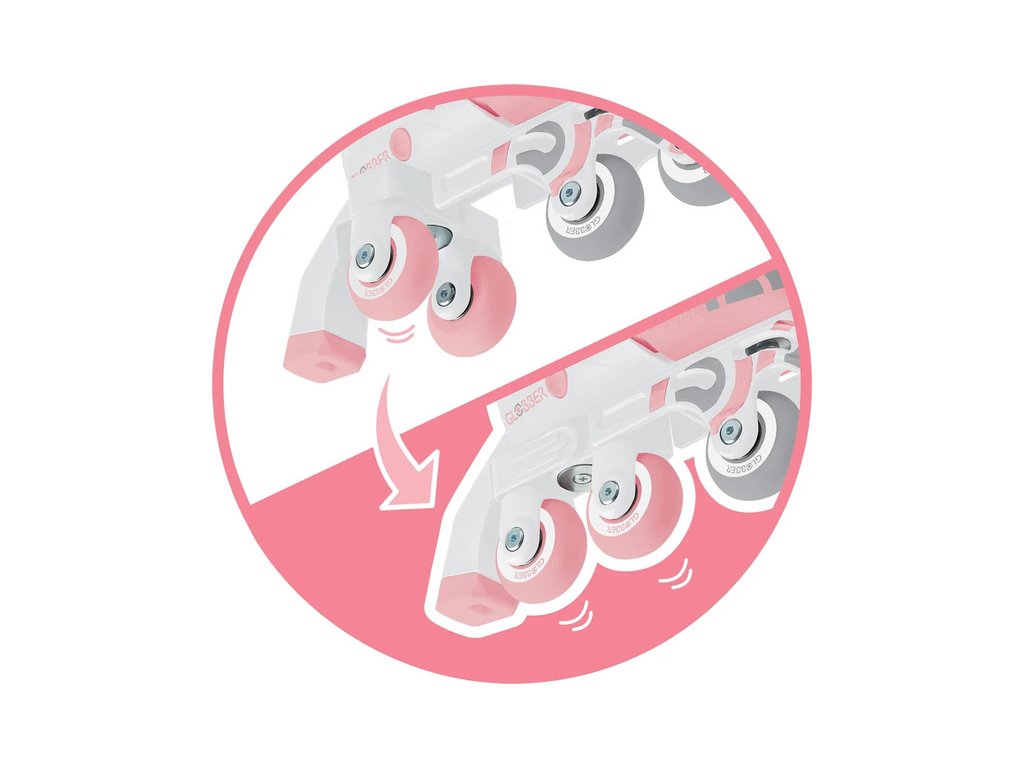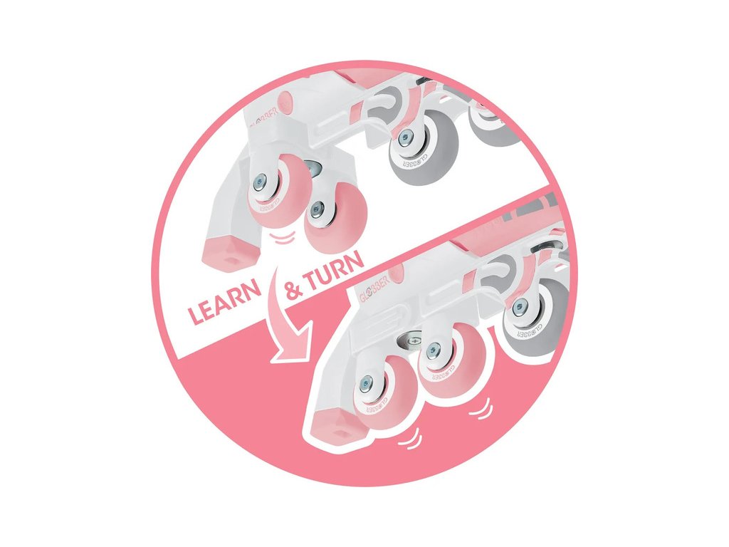Globber - Dětské kolečkové brusle 2v1, vhodné jako první brusle na učení, díky možnosti jednoduchého otočení zadních koleček, které můžou být vedle sebe pro vyšší stabilitu. Nastavitelné délka boty EU 26-29. Kolečka z PU ø48mm (šířka 24mm). Kvalitní ložiska ABEC 5. Zadní TPR brzda. Přezkové zapínaní.