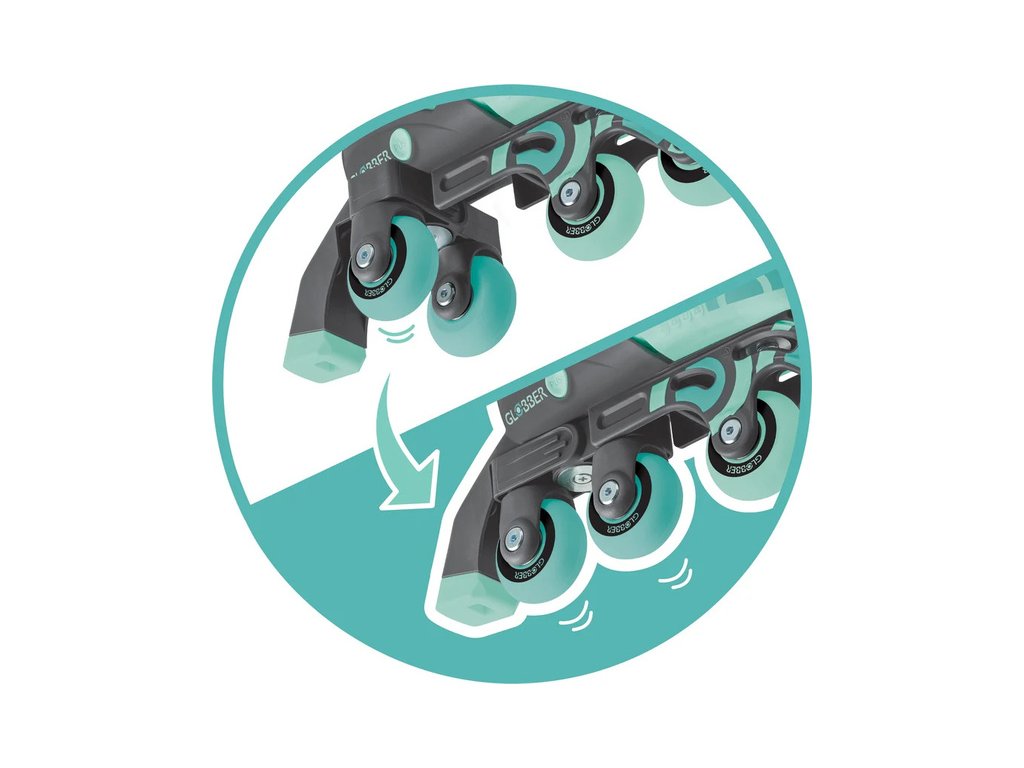 Kolečkové brusle pro děti s kombinací zábavy a učení. Jsou vybaveny inovativním otočným modulem zadních koleček, který vám umožňuje snadno přepínat mezi dvěma režimy: režimem učení a režimem inline. Zadní modul jednoduše otočíte o 90°, bez použití nářadí.