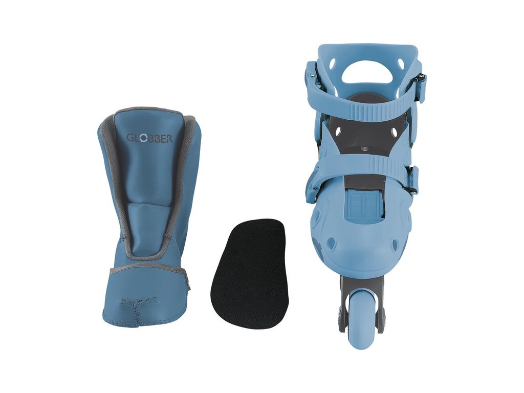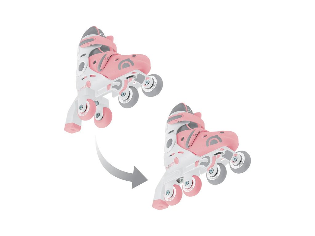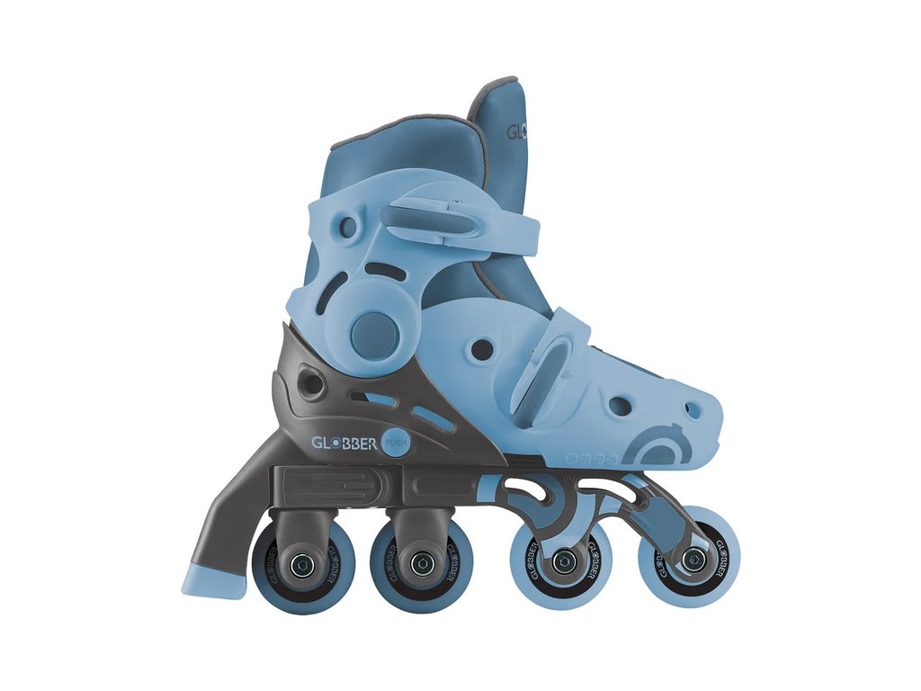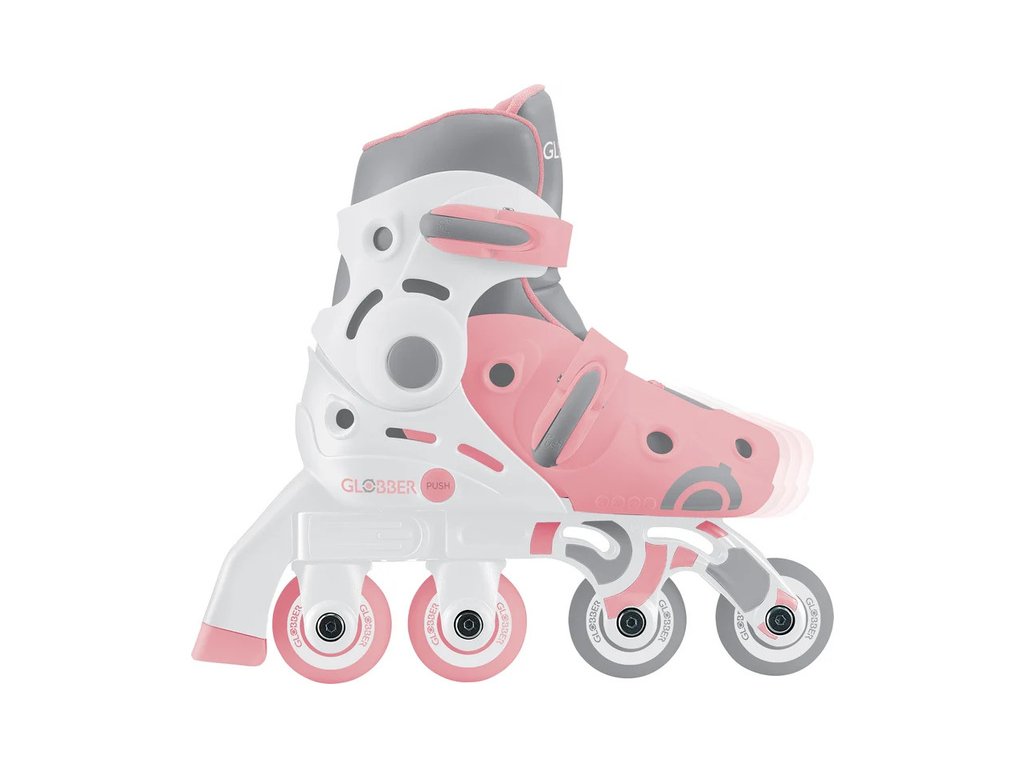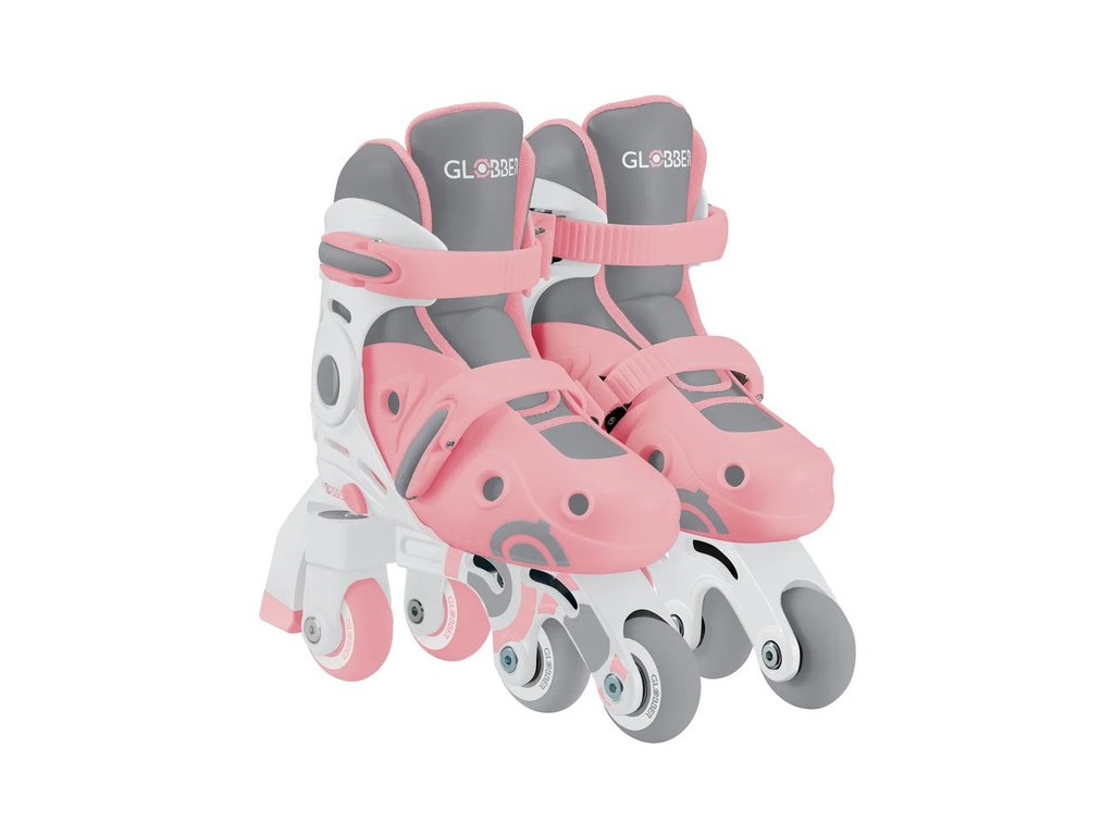 Globber - Dětské kolečkové brusle 2v1, vhodné jako první brusle na učení, díky možnosti jednoduchého otočení zadních koleček, které můžou být vedle sebe pro vyšší stabilitu. Nastavitelné délka boty EU 26-29. Kolečka z PU ø48mm (šířka 24mm). Kvalitní ložiska ABEC 5. Zadní TPR brzda. Přezkové zapínaní.