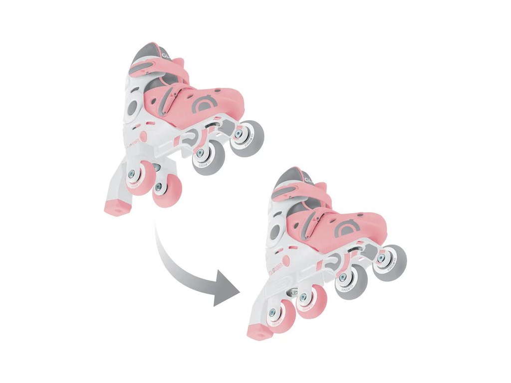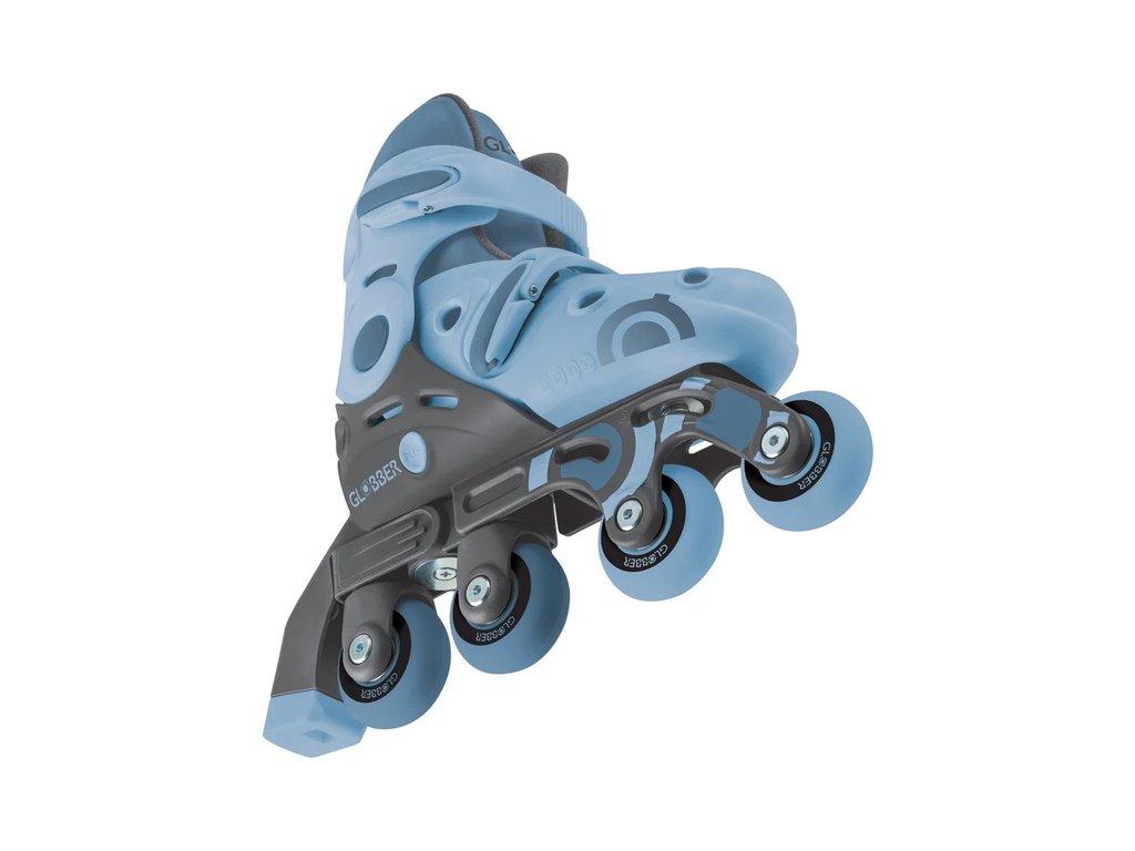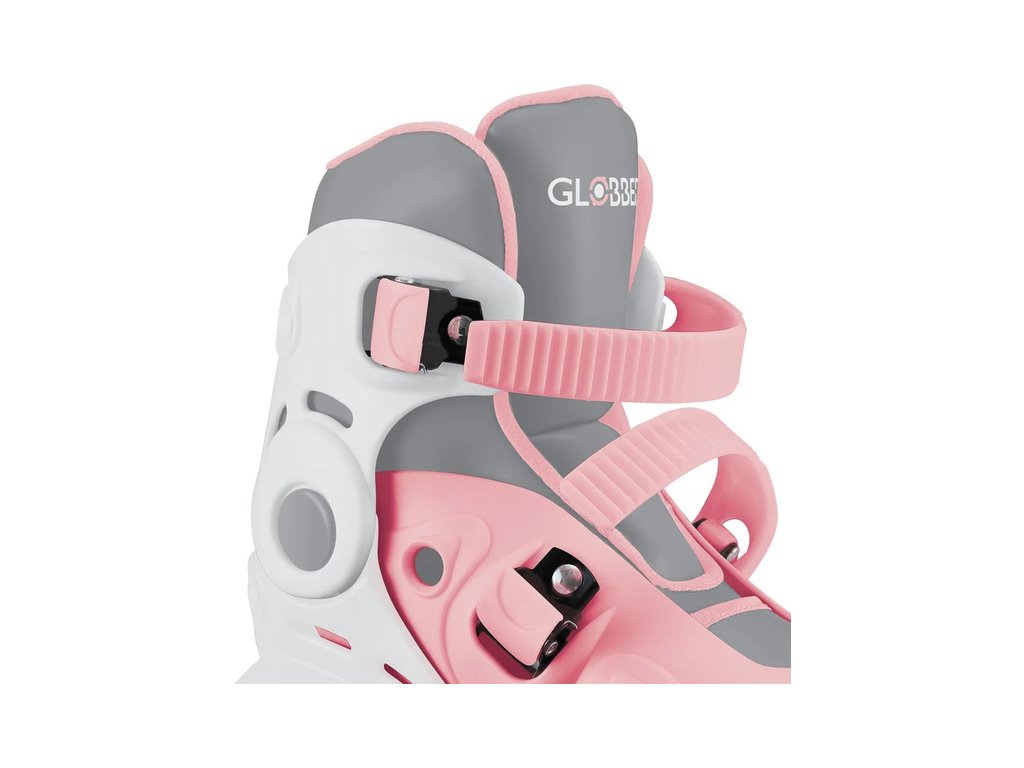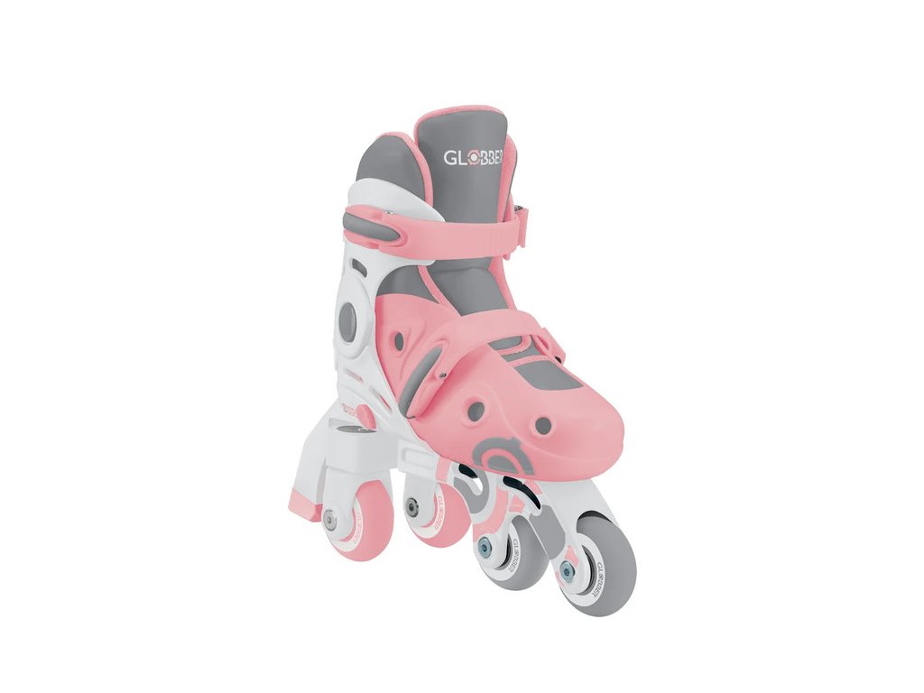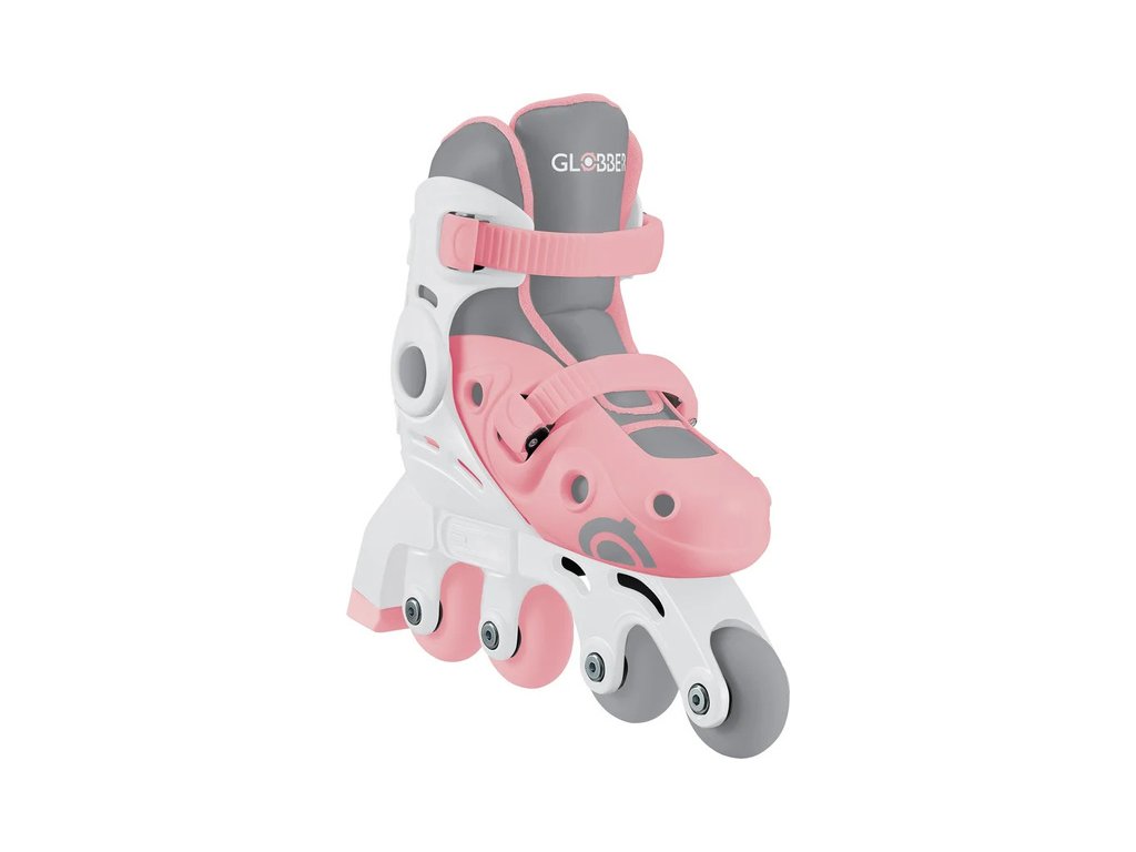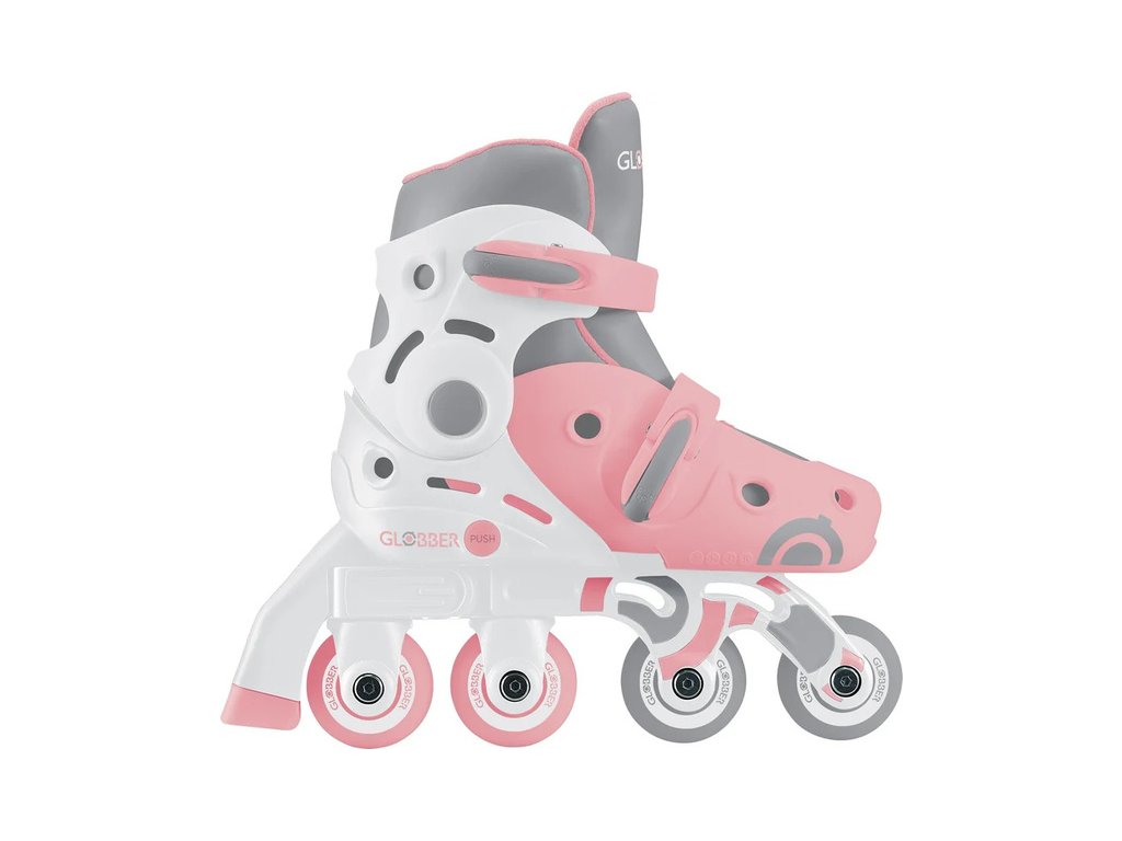 Globber - Dětské kolečkové brusle 2v1, vhodné jako první brusle na učení, díky možnosti jednoduchého otočení zadních koleček, které můžou být vedle sebe pro vyšší stabilitu. Nastavitelné délka boty EU 30-33. Kolečka z PU ø54mm (šířka 24mm). Kvalitní ložiska ABEC 5. Zadní TPR brzda. Přezkové zapínaní.