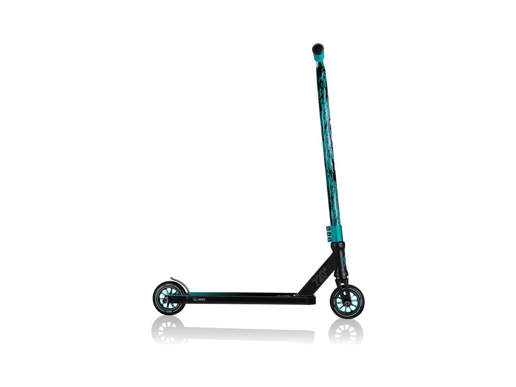 Koloběžka Globber - GS 720, pro děti od 8 let, teenagery a dospívající, kteří se kromě jízdy chtějí naučit freestylové triky. Přední vidlice vyztužená ocelí, trojitá spona řídítek, kvalitní kolečka 110 mm s tvrdostí 88A PU, hliníkové jádro a špičková ložiska 680ZZ ABEC 7, stupačky.
