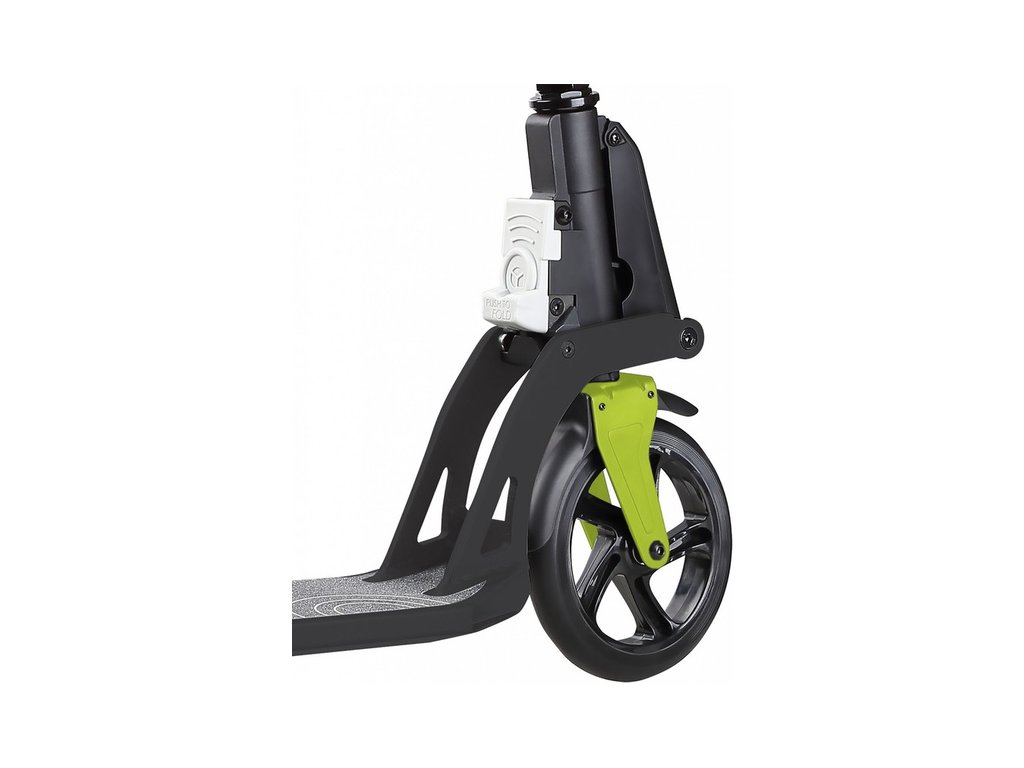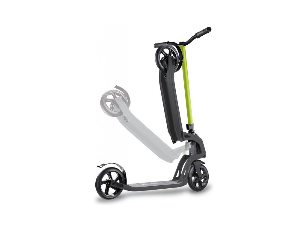 Koloběžka je vybavena unikátním skládacím systémem. Patentovaný píst usnadní a urychlí skládání. Stačí jen "kopnout" do tlačítka a koloběžka je během jedné sekundy složena. Koloběžka se tak dostane do velmi kompaktního tvaru, složenou ji můžete snadno převážet, uskladnit nebo vést za sebou.