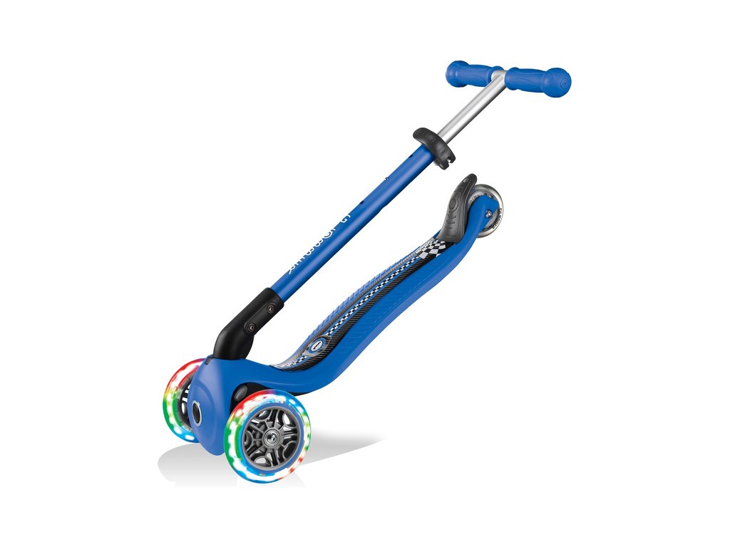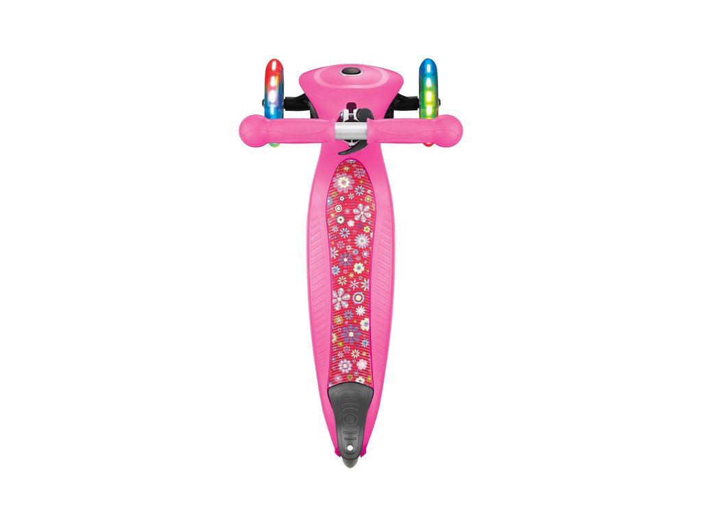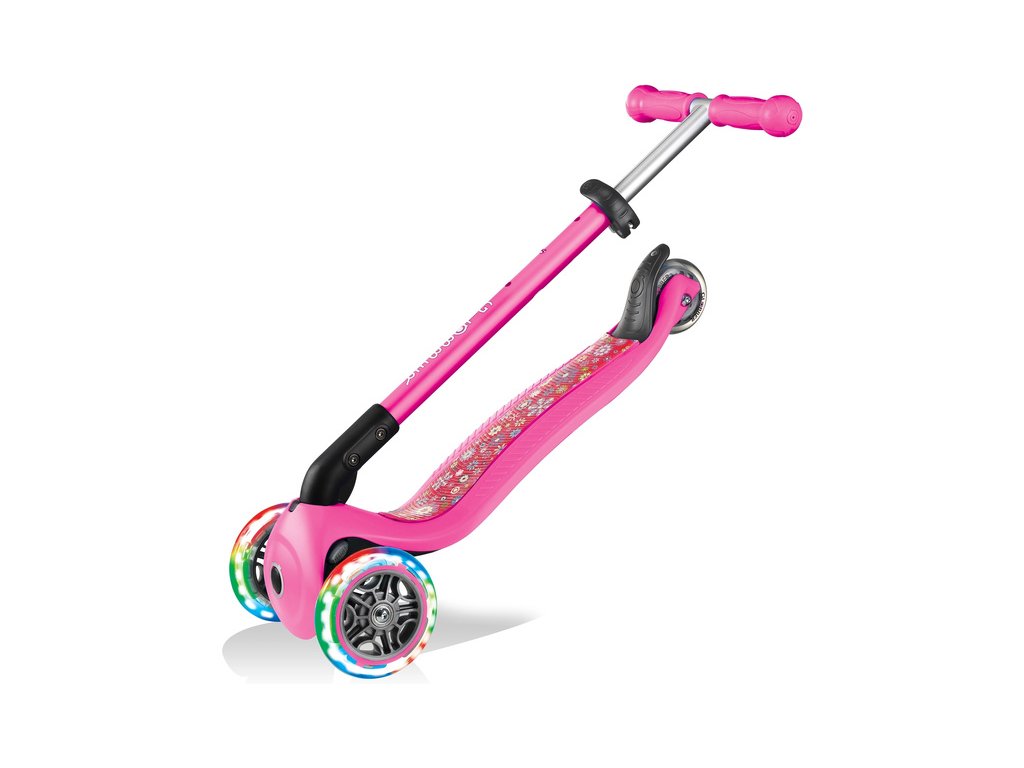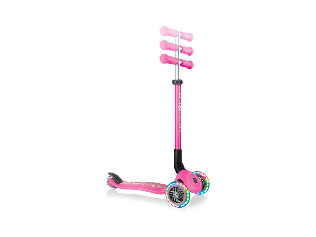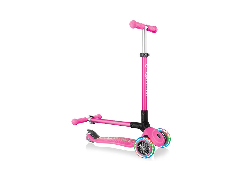 Unikátní koloběžka Primo skládací Lights s Fantasy motivem od firmy Globber, je určena pro děti od 3 let do hmotnosti 50kg. Je skládací, má svítící kolečka, ergonomickou nášlapnou část s protiskluzovou vrstvou a vyztužena je ocelovým profilem. Brzda z kompozitního materiálu, velká kolečka 121mm, kvalitní materiály, patentovaná technologie zatáčení. Kolečka z odolné gumy, kvalitní ložiska ABEC 5.