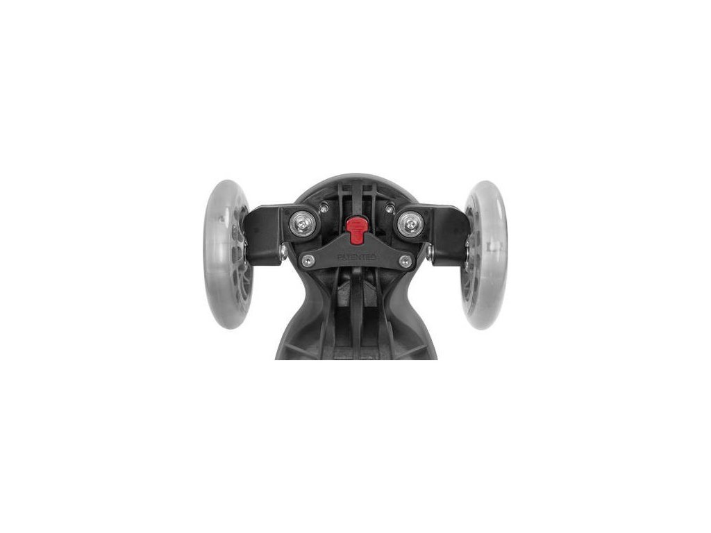 Naučte děti rychleji na koloběžce! Koloběžka je vybavena patentovaným systémem zatáčení s aretačním tlačítkem. Tlačítko zafixuje řízení a koloběžka nezatáčí do stran, tím se děti rychleji naučí držet rovnováhu. Odemknutím tlačítka se aktivuje řízení (pohybe řídítek do stran, zatáčejí kola).
