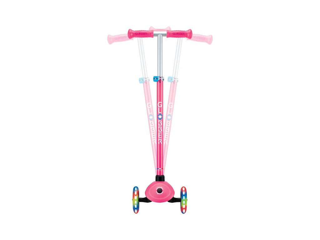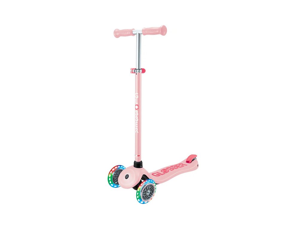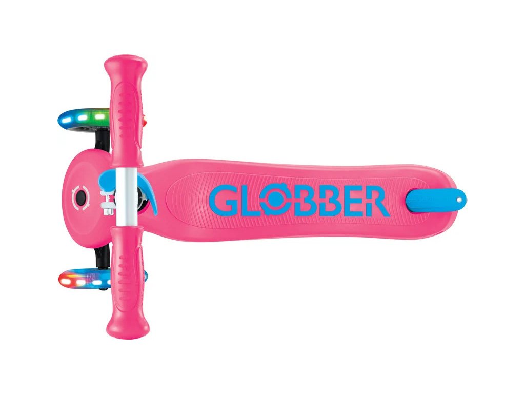 Koloběžka Primo Plus Lights V2 od firmy Globber, je určena pro děti od 3 do 9 let. Ergonomické tělo, svítící kolečka, kvalitní materiály, patentovaná technologie zatáčení. Kolečka z vysoce odolné gumy (Polyuretan), kvalitní ložiska ABEC 5.Výška řídítek až 82 cm.