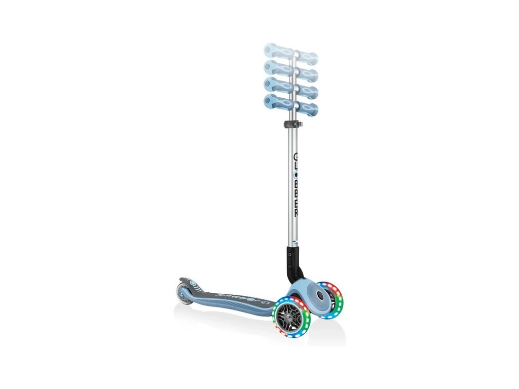 Unikátní koloběžka Primo skládací Lights od firmy Globber, je určena pro děti od 3 let do hmotnosti 50 kg. Je skládací, má svítící kolečka, ergonomickou nášlapnou část s protiskluzovou vrstvou a vyztužena je ocelovým profilem. Brzda z kompozitního materiálu, velká kolečka 121mm, kvalitní materiály, patentovaná technologie zatáčení. Kolečka z odolné gumy, kvalitní ložiska ABEC 5. Nastavitelná řídítka ve čtyřech polohách, kvalitní gumové rukojeti..