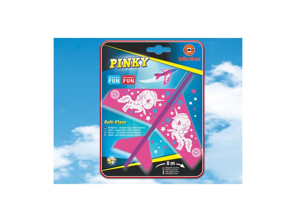 Pinky je vrhací kluzák navržený pro maximální zábavu i bezpečnost. Díky svému unikátnímu aerodynamickému tvaru zvládá jak klouzavé lety na dlouhé vzdálenosti, tak vzrušující smyčky a akrobatické triky. Vhodný pro děti už od 4 let a skvělý i pro dospělé, kteří se nebojí vrátit do dětských let!