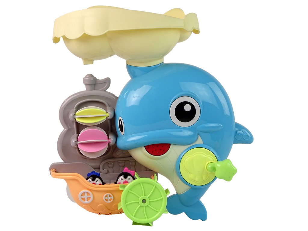 Velký delfín vytváří pod vlivem vodního paprsku nádherný vodopád. Nejprve naberte vodu naběračkami ve tvaru želvy a ryby a poté ji nalijte do nádoby nad hlavou delfína. Pod proudem vody se vytvoří nádherný vodopád, ale to není všechno. Horní nádoba je rozdělena na dvě části. Jedna teče do válců a vytváří vodopád, zatímco ve druhé části voda teče do delfínovy tlamy.