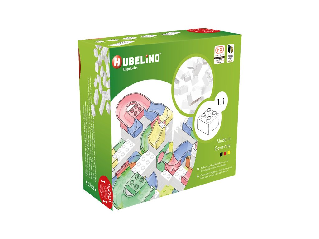 Kuličková dráha HUBELINO je vyráběna v Německu z ekologicky šetrného materiálu. Poskytuje spousty zábavy a kreativity, podporuje logické myšlení i smysl pro detail. Dílky stavebnice jsou kompatibilní s kostkami LEGO Duplo.