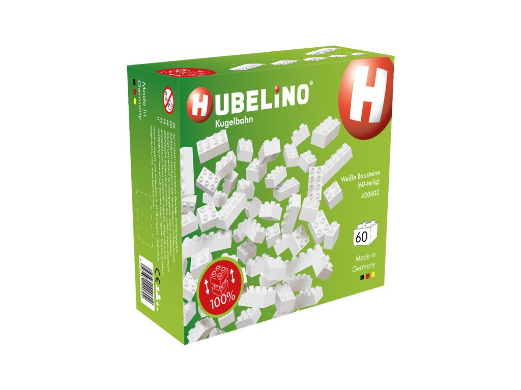 HUBELINO Kuličková dráha - bílé kostky 60 dílků. Skládejte kostky dle fantazie, přestavujte kuličkovou dráhu a rozšiřte ji s těmi kostkami. Vhodné pro děti od 4 let.