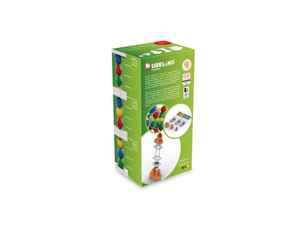 HUBELINO Kuličková dráha - rozšíření výtah 24 dílků. Tento set vám pomůže vytvořit ještě větší kuličkovou dráhu. Díky důmyslné technologií kuličkového výtahu je po dokončení zběsilé jízdy konečně možné přesunout kuličku zpět na začátek dráhy a vytvořit tak nikdy nekončící zábavu.