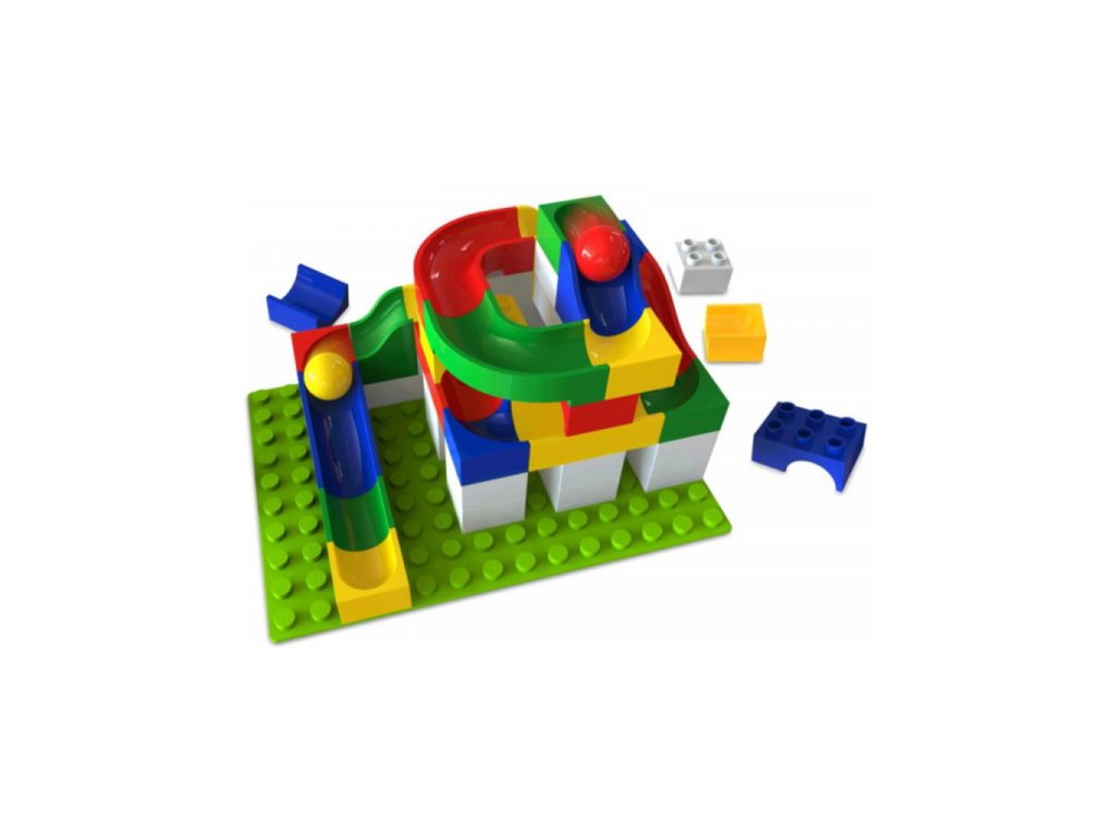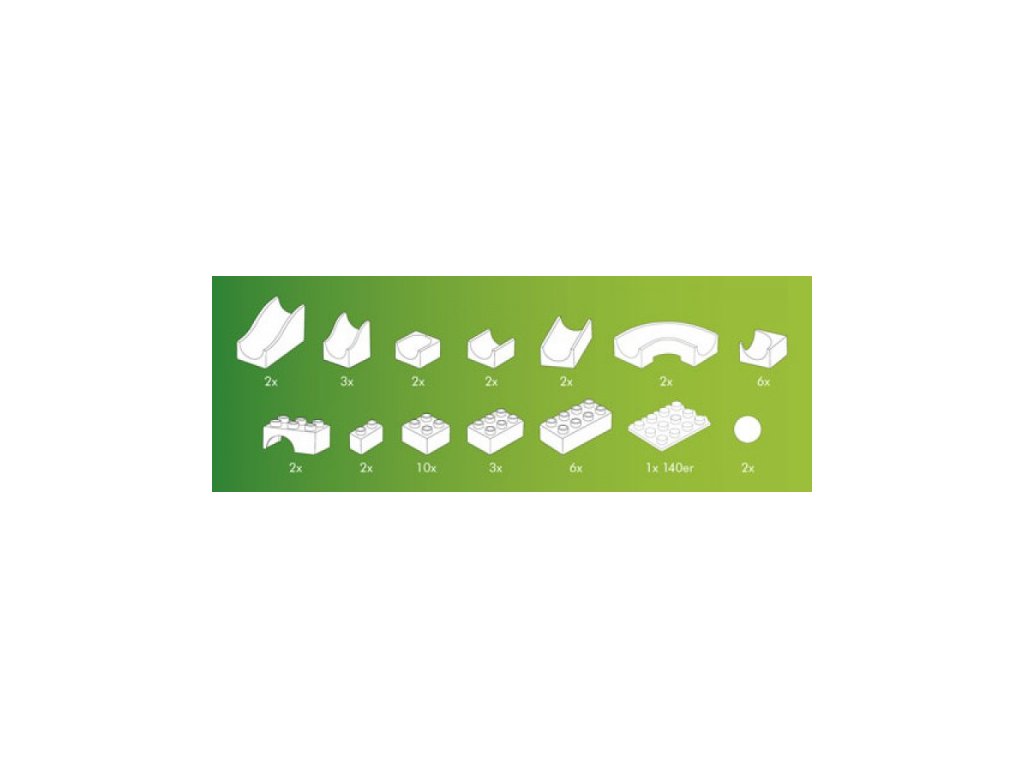 Hubelino kuličková dráha obsahuje: 43 stavebních dílků, 2 kuličky