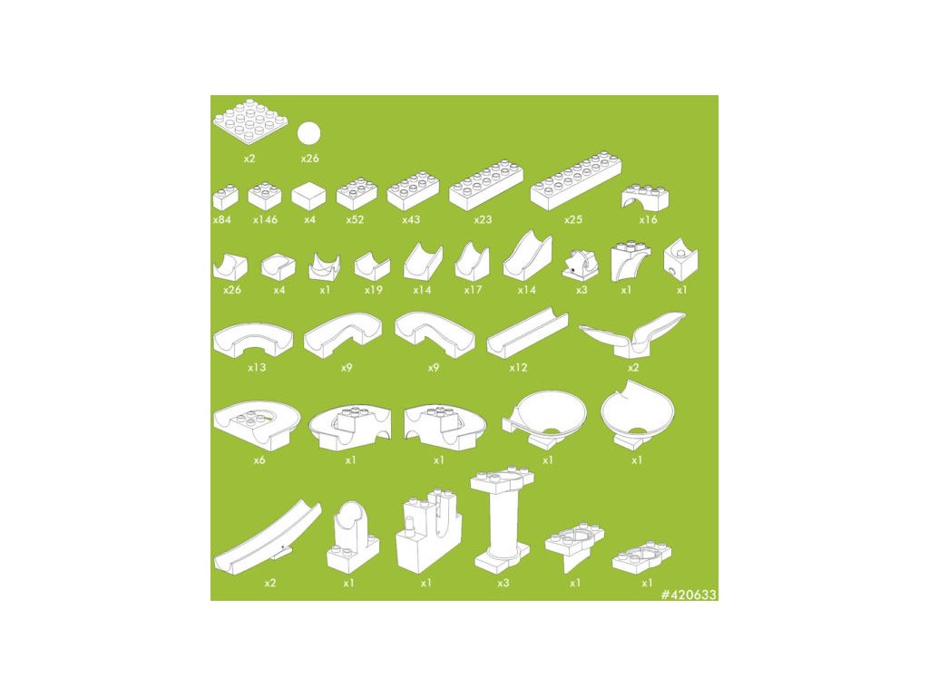 Set Mega obsahuje: 585 dílků (162 prvků dráhy, 377 stavebních kostek, 18 speciálních prvků, 2 základní desky, 26 kuliček) + obrázkový návod na sestavení varianty A1, B1 a C1.