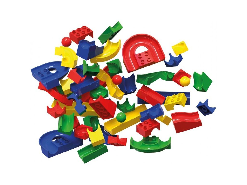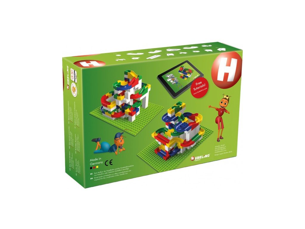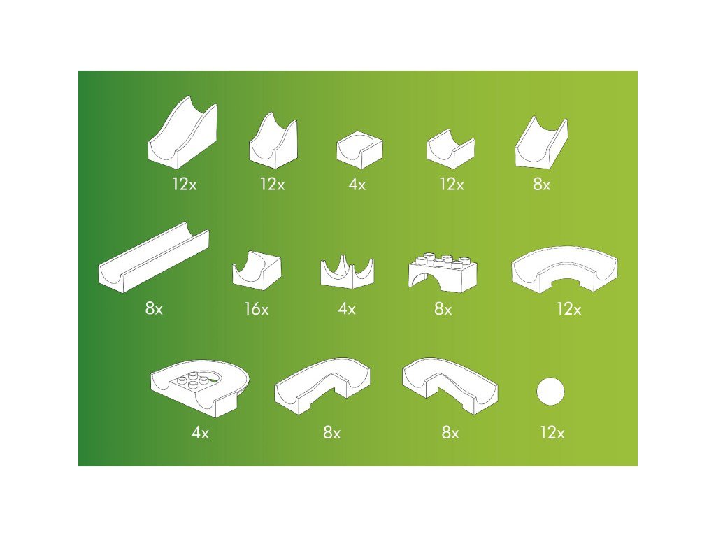 Hubelino kuličková dráha obsahuje: 116 stavebních dílků včetně 12 kuliček