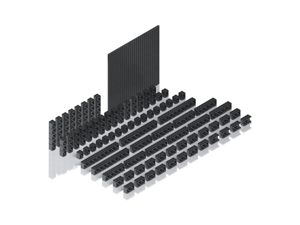 Kostky M obsahují: 43 kostek nosníků, 30 kostek vazníků, 1 základní deska, 4 tunelové adaptery, 1 návod k použití.