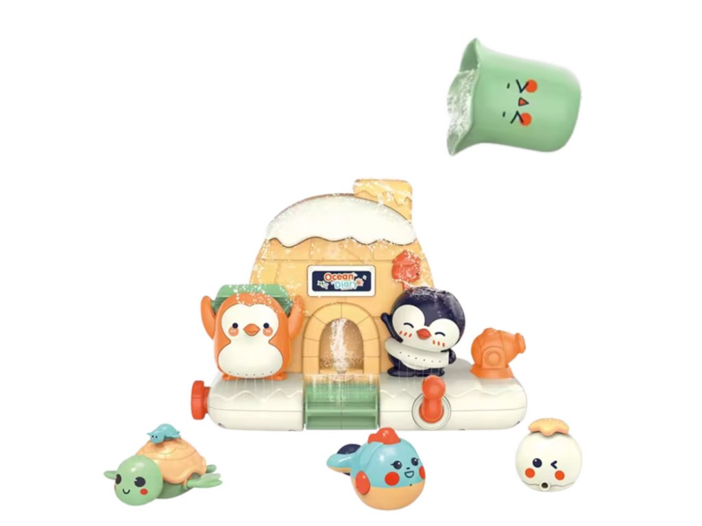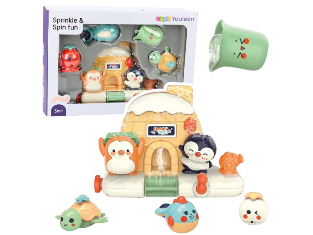Ústředním prvkem sady je barevné iglú, které slouží jako základna s vestavěnými vodními mechanismy. Po naplnění vodou mohou děti spustit postřikovače, otáčet knoflíky a ovládat proud vody, čímž aktivují i zábavnou funkci fontány. Mořská zvířata obsažená v sadě, jako je klaunská ryba, chobotnice, tučňák nebo želva, mají funkci stříkání vody a reagují na tlak, což navíc obohacuje zábavu.