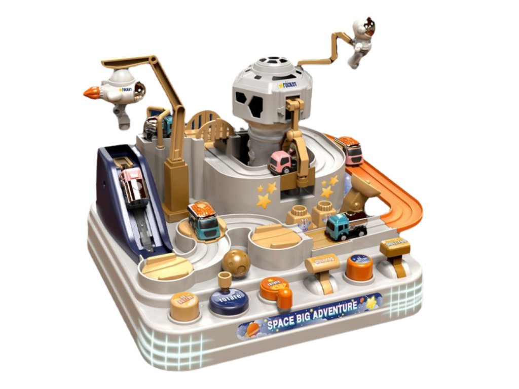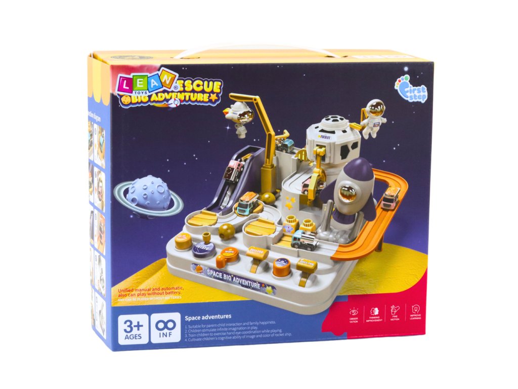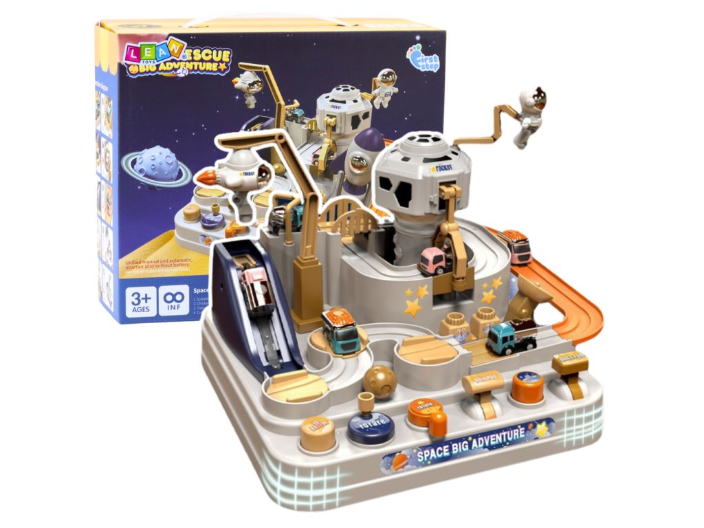 Zde je úžasná, multifunkční interaktivní vesmírná dráha, která nejen zaujme svým designem a kvalitou zpracování, ale také aktivně podporuje rozvoj dítěte. Je to skutečná vesmírná základna plná dobrodružství, kde malí průzkumníci najdou až 10 různých mechanických aktivit – všechny ovládané ručně, bez nutnosti baterií. Mezi funkce patří mimo jiné raketomety, pohyblivé jeřáby, skluzavky, výtahy, tunely, padací dveře, otočné plošiny a barevná tlačítka, která aktivují následné prvky systému.