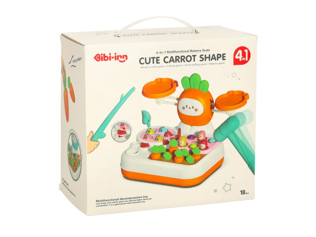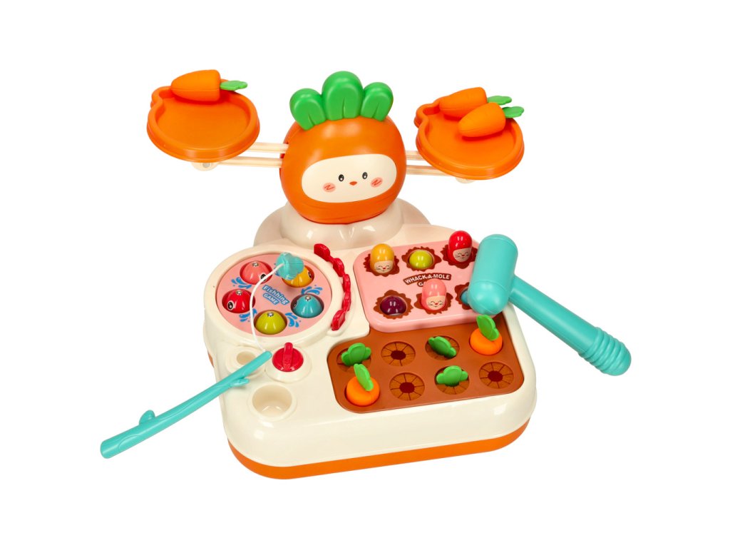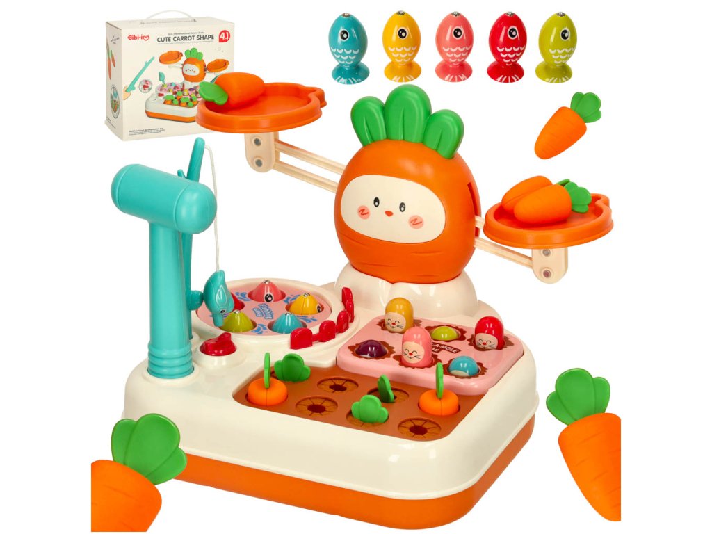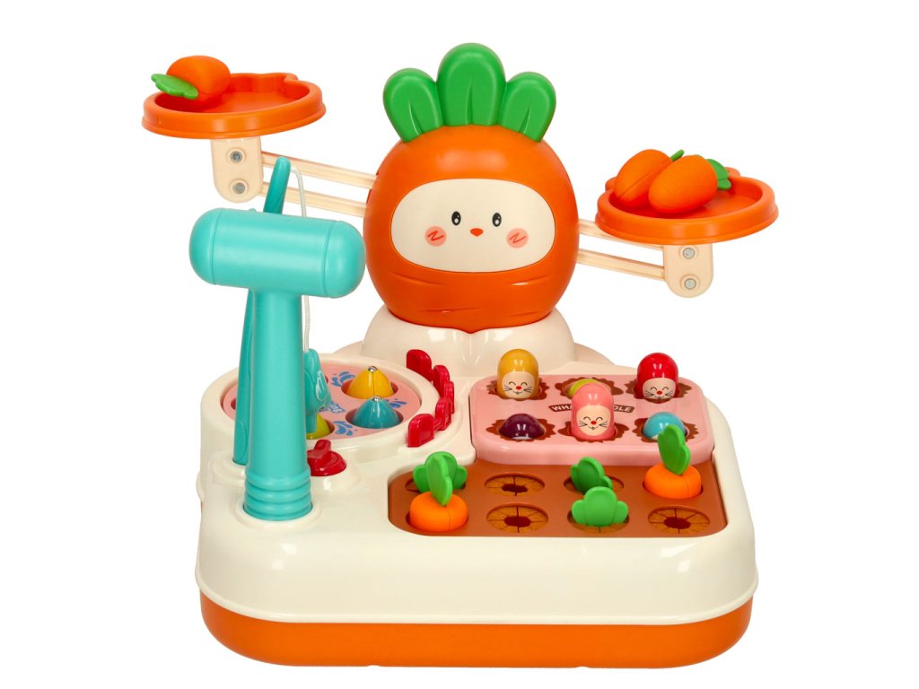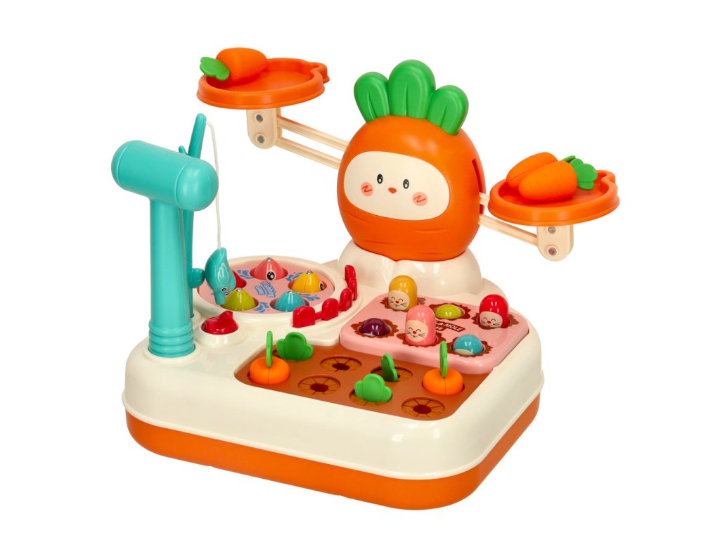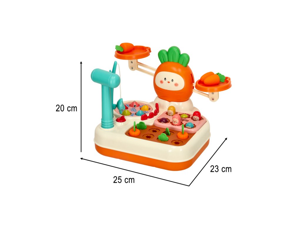 Multifunkční hračka, která podporuje rozvoj motorické koordinace, obratnosti a logického myšlení. Sada kombinuje několik interaktivních her, jako je rybaření, házení krtka, sbírání mrkve a vyvažování váhy. Každá z těchto her je skvělou příležitostí k učení se prostřednictvím aktivní hry. Děti si osvojí dovednosti v počítání a zároveň si rozvinou koordinaci oko-ruka a obratnost. Sada obsahuje plastové kladivo a rybářský prut, které jsou nezbytné pro hru.
