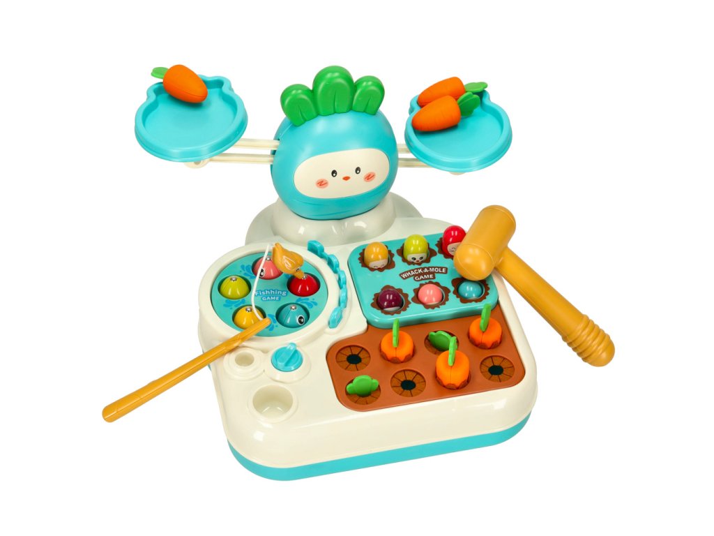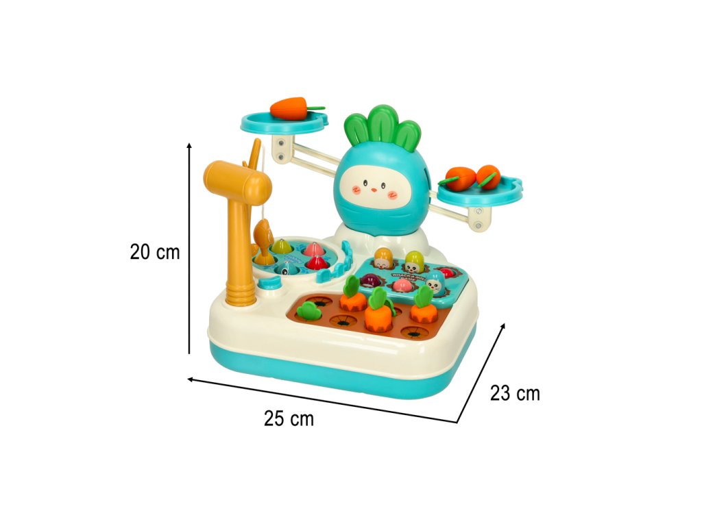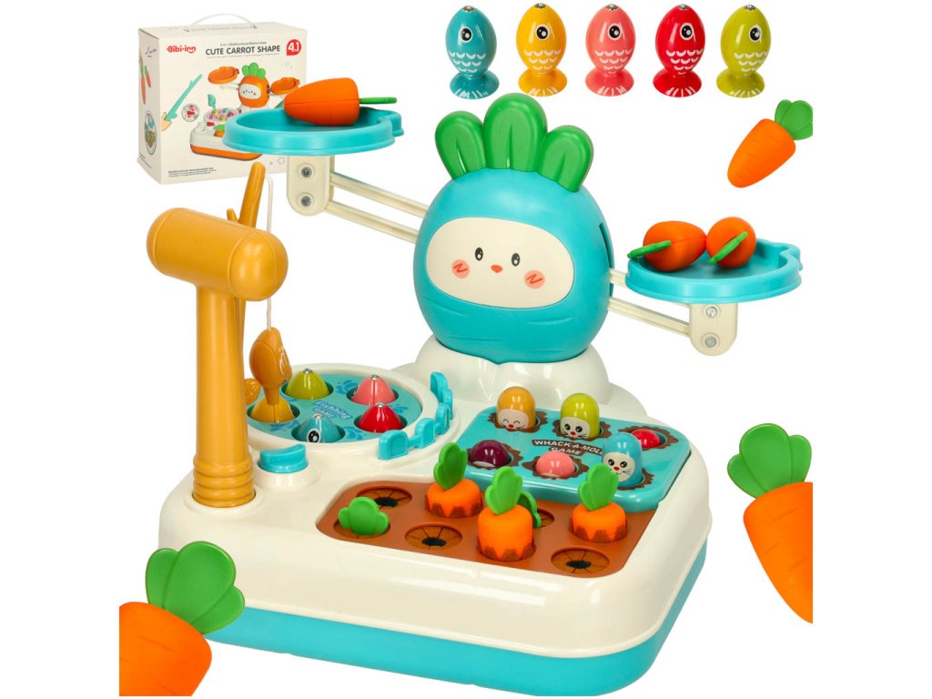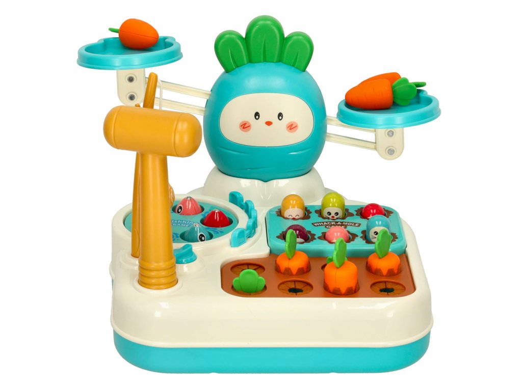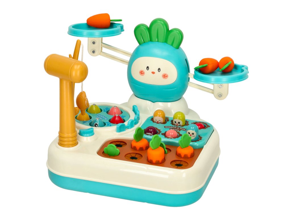 Multifunkční hračka, která podporuje rozvoj motorické koordinace, obratnosti a logického myšlení. Sada kombinuje několik interaktivních her, jako je rybaření, házení krtka, sbírání mrkve a vyvažování váhy. Každá z těchto her je skvělou příležitostí k učení se prostřednictvím aktivní hry. Děti si osvojí dovednosti v počítání a zároveň si rozvinou koordinaci oko-ruka a obratnost. Sada obsahuje plastové kladivo a rybářský prut, které jsou nezbytné pro hru.