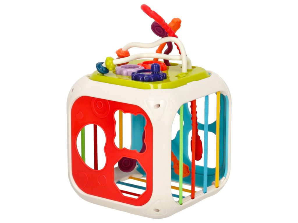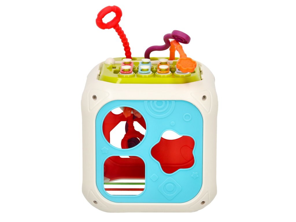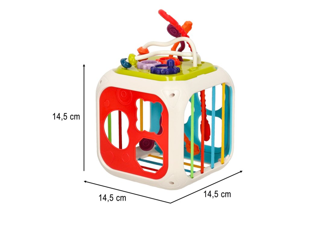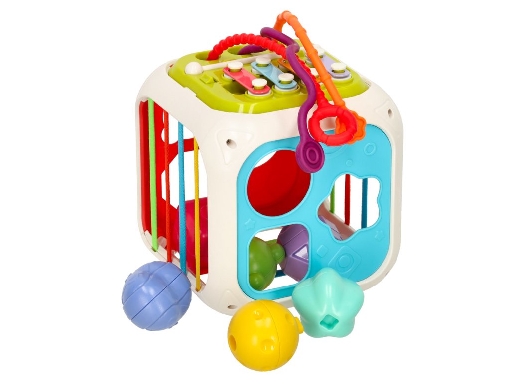 Vzdělávací senzorická kostka je hračka určená pro děti od 18 měsíců a starší, která podporuje senzorický, motorický a kognitivní vývoj. Každá strana kostky nabízí různé interaktivní prvky, jako je přiřazování kostek k otvorům, mini xylofon, tahání za provázky a pohyblivé korálky na tyčkách. Sada obsahuje šest barevných kostek, které lze přiřazovat k otvorům nebo skládat na sebe, což rozvíjí manuální dovednosti dítěte.
