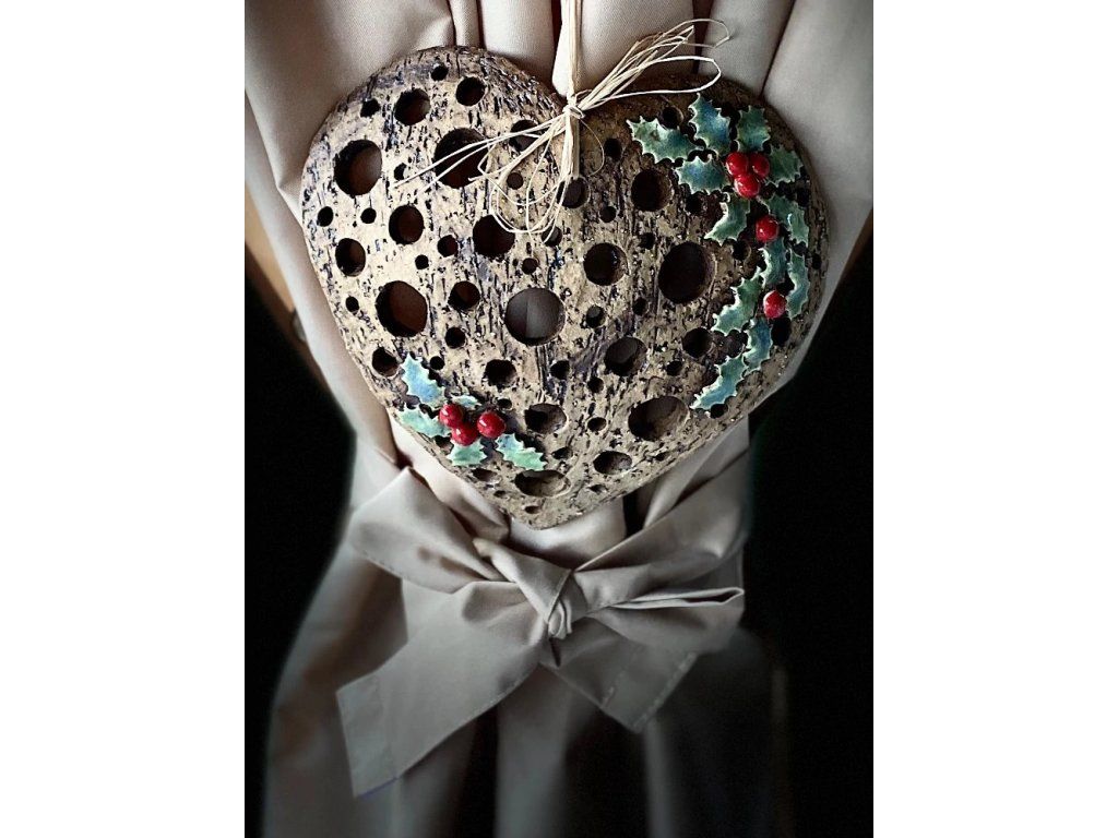 Keramické srdce na zavěšení s výřezem a motivem cesmíny je krásná dekorace, která dodá vašemu domovu nebo zahradě jemný a slavnostní vzhled ❤️🌿.