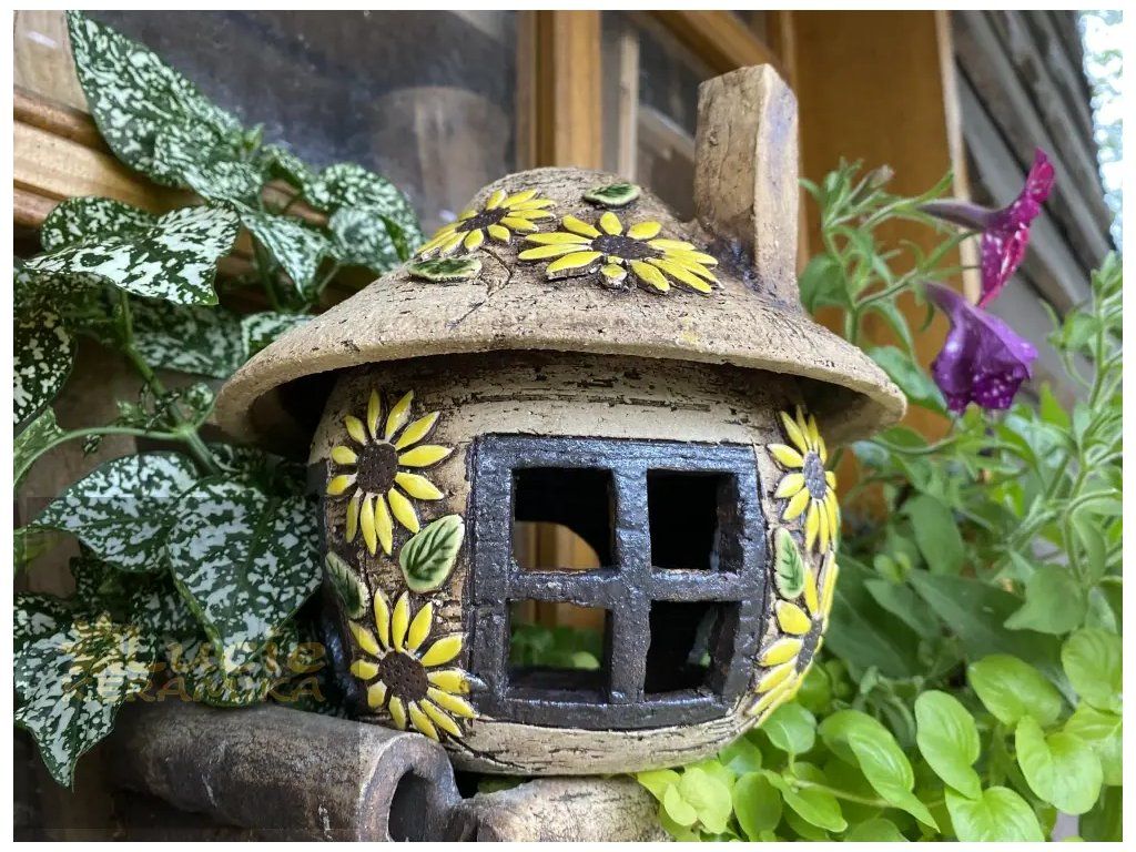 Keramický domeček se slunečnicemi je kouzelná dekorace, která vnese do vašeho domova nebo zahrady příjemnou a hřejivou atmosféru 🌻🏠.