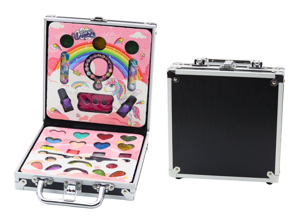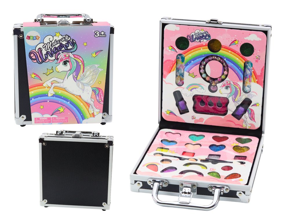 Kosmetická sada v elegantním kufru je ideální volbou pro mladé milovníky líčení a stylingu. Kufr je vyroben z masivního černého materiálu s efektními stříbrnými prvky, které dodávají jeho jedinečné kouzlo. Je lehký, praktický a snadno se přenáší, což z něj dělá ideální volbu na cesty nebo setkání s přáteli.