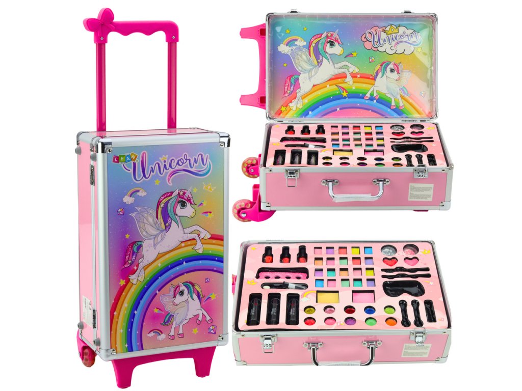 Sada kosmetiky pro děti v kufříku s jednorožcem je perfektním produktem pro každou malou milovnici líčení a stylingu. Velký, barevný kufřík s roztomilou grafikou jednorožce ukrývá kompletní sadu líčení, určenou speciálně pro děti. Díky výsuvné rukojeti a kolečkům může dítě snadno přepravovat svou kosmetickou taštičku kamkoli - ke kamarádce, na dovolenou nebo prostě jen po domě. Produkt nejenže poskytuje hodiny kreativní hry, ale také podporuje rozvoj fantazie a manuálních dovedností.