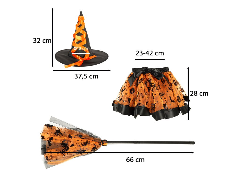 Kostým karnevalové čarodějnice bude středem pozornosti každé tematické párty! Sada obsahuje tylovou sukni na gumičce, vysoký klobouk a koště – vše, co malá čarodějnice potřebuje. Oranžové akcenty upoutají pozornost každého. Díky všité gumičce je kostým vhodný pro děti ve věku 3-6 let.