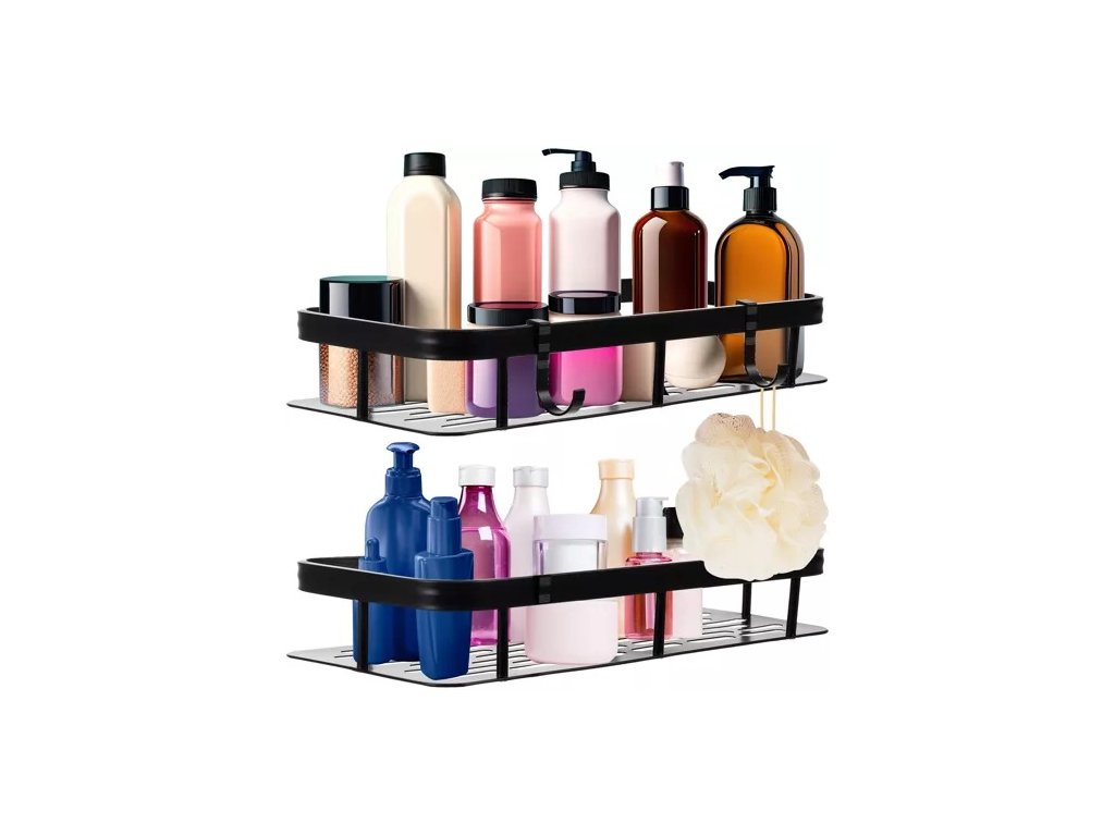 - 2 POLICE + DALŠÍ HÁČKY - v sada obsahuje dvě police, což výrazně zvyšuje kapacitu a umožňuje uskladnit více kosmetiky nebo koření. Můžete na ni uložit například šampony, kondicionéry nebo sprchové gely. Police mají další háčky, na které můžete zavěsit houbu nebo žínku.