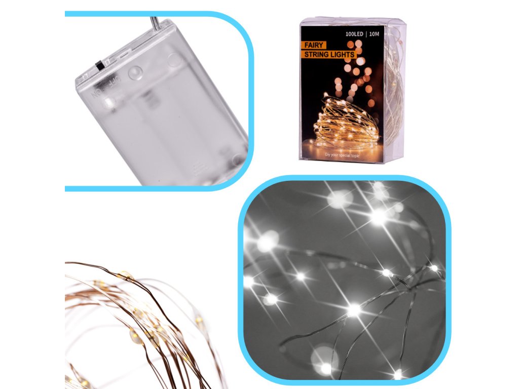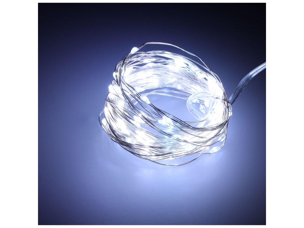 Ohebný stříbrný drát s LED diodami je skvělým základem pro nejrůznější kutilské projekty. Dobře fungují například ve světlech vytvořených z lahví. Na internetu najdete spoustu nápadů, jak je použít ve vánočních dekoracích!Světla na jemném drátu jsou sama o sobě vynikající dekorací! Lze je použít například k výzdobě vánočního stolu. Malé, jemné LED diody vnesou do místnosti útulnou, romantickou atmosféru. 5 metrů stačí na ozdobení např. okraje postele nebo okenního rámu.Žádný kabel - žádný problém! Světla můžete použít, kdekoli chcete! Nejste omezeni zásuvkami a kabely. Světla jsou napájena 3 bateriemi AA (nejsou součástí dodávky).