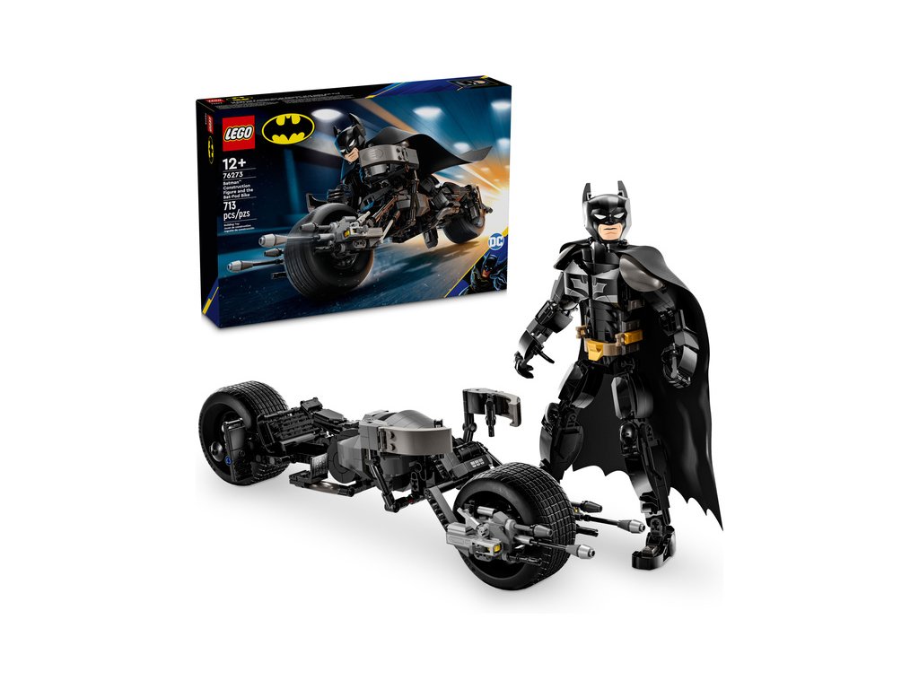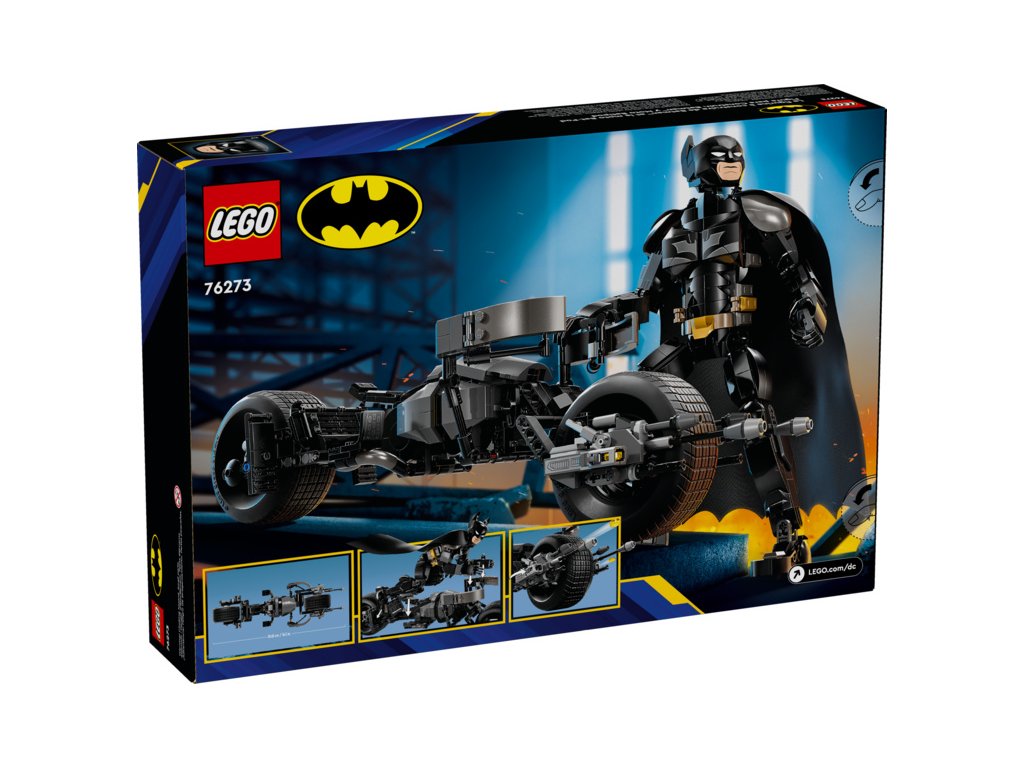 Pohyblivá stavebnice LEGO® DC Batman™ (76273) Sestavitelná figurka: Batman a motorka Bat-Pod představuje úchvatnou akční figurku inspirovanou filmem Temný rytíř a potěší fanoušky slavného superhrdiny od 12 let. Tato vysoká, propracovaná hračka je plně pohyblivá, měří přes 26 cm na výšku a je také parádním sběratelským kouskem.