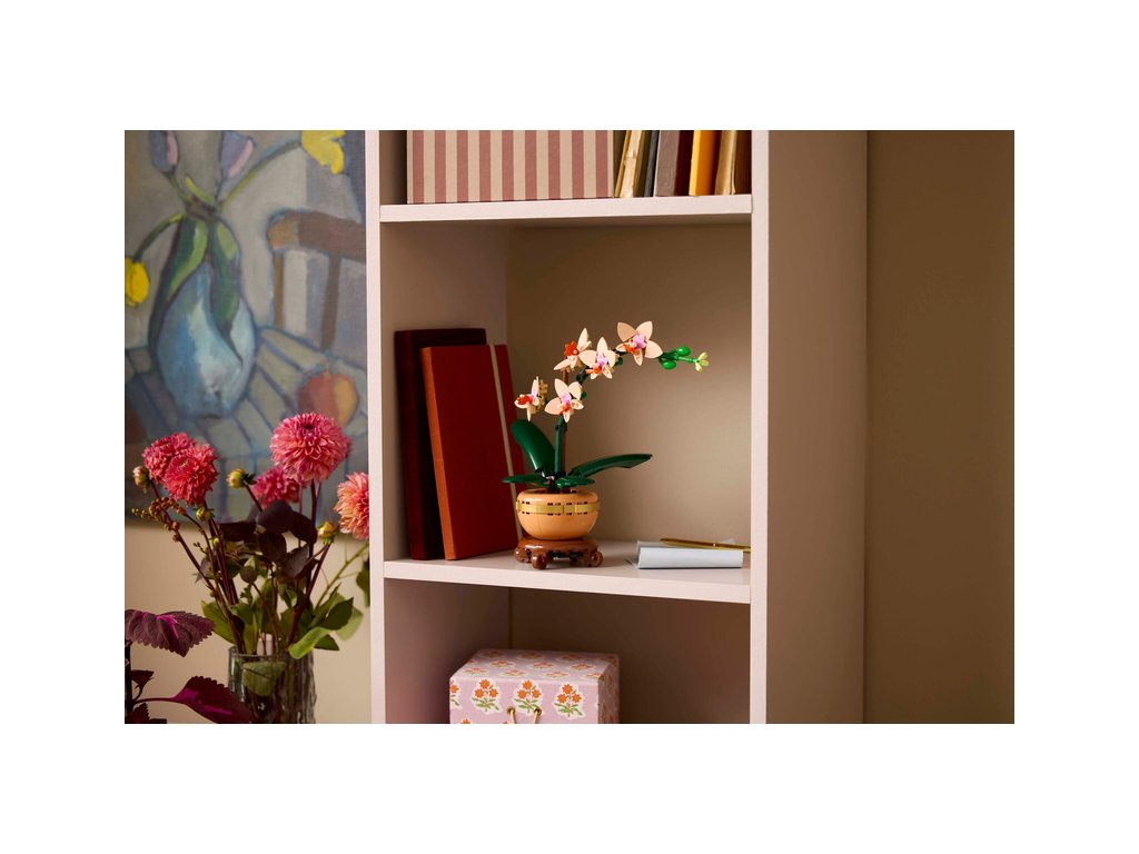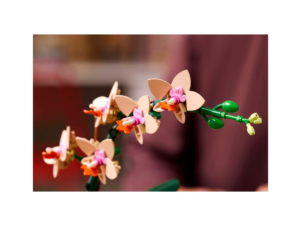 Tato věrná replika obsahuje 5 kvetoucích květů orchideje, několik poupat a listy. Součástí je také světlý terakotový květináč v na krásném podstavci s efektem dřeva. Začínající květináři si tuto krásnou květinu z kostek LEGO můžou vystavit doma nebo v kanceláři a dodat místu kousek klidné přírody.