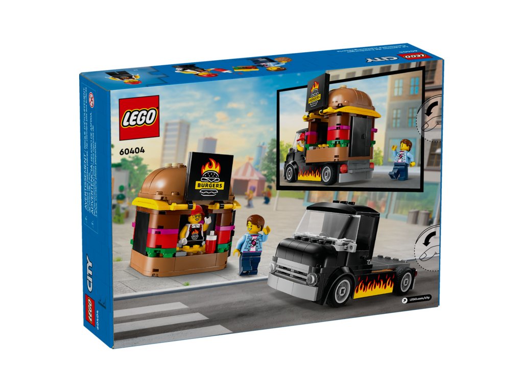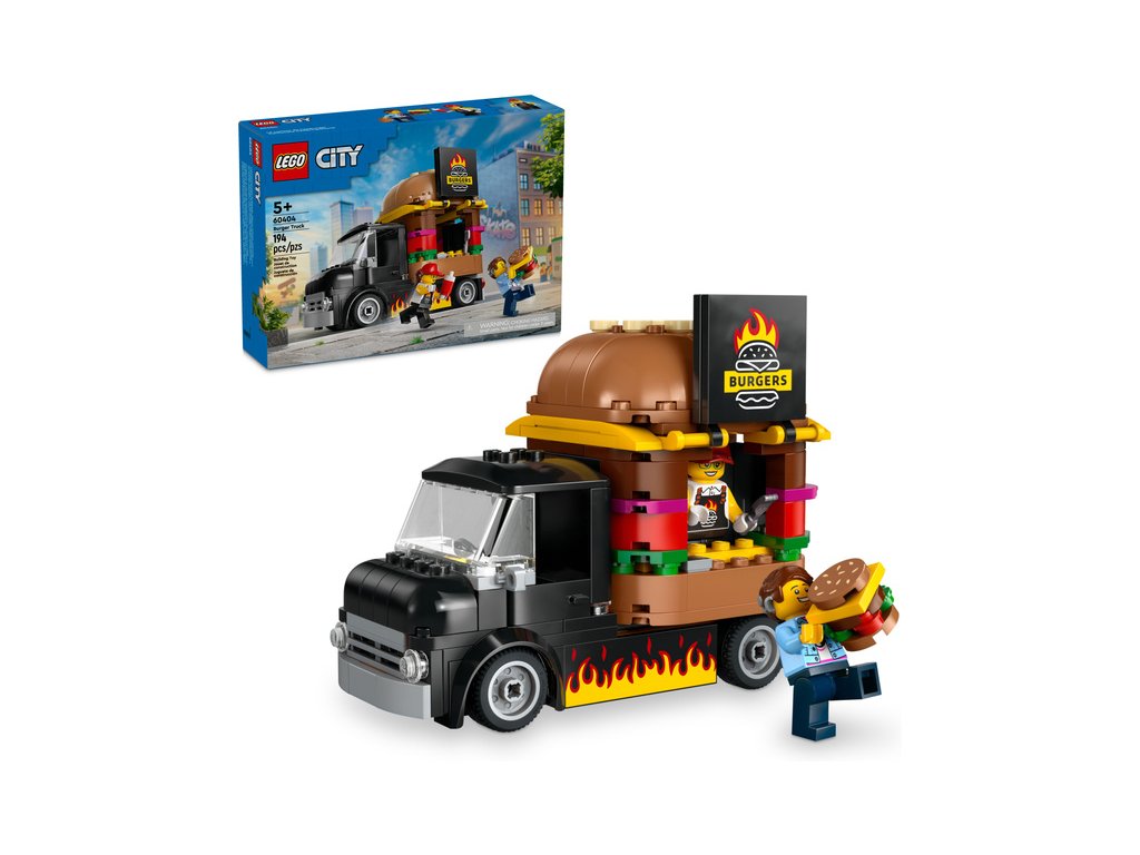 Stavebnice LEGO® City (60404) Hamburgerový truck rozproudí fantazii malých stavitelů od 5 let. Střechu pojízdné prodejny hamburgerů zdobí obří burger a propracovaný prostor na přípravu jídla s řadou omáček a dochucovadel lze vyjmout. Zvedněte dvířka a odhalte ceduli s burgerem grilovaným na ohni. Součástí stavebnice je také minifigurka prodejce a zákazníka s naslouchátkem.