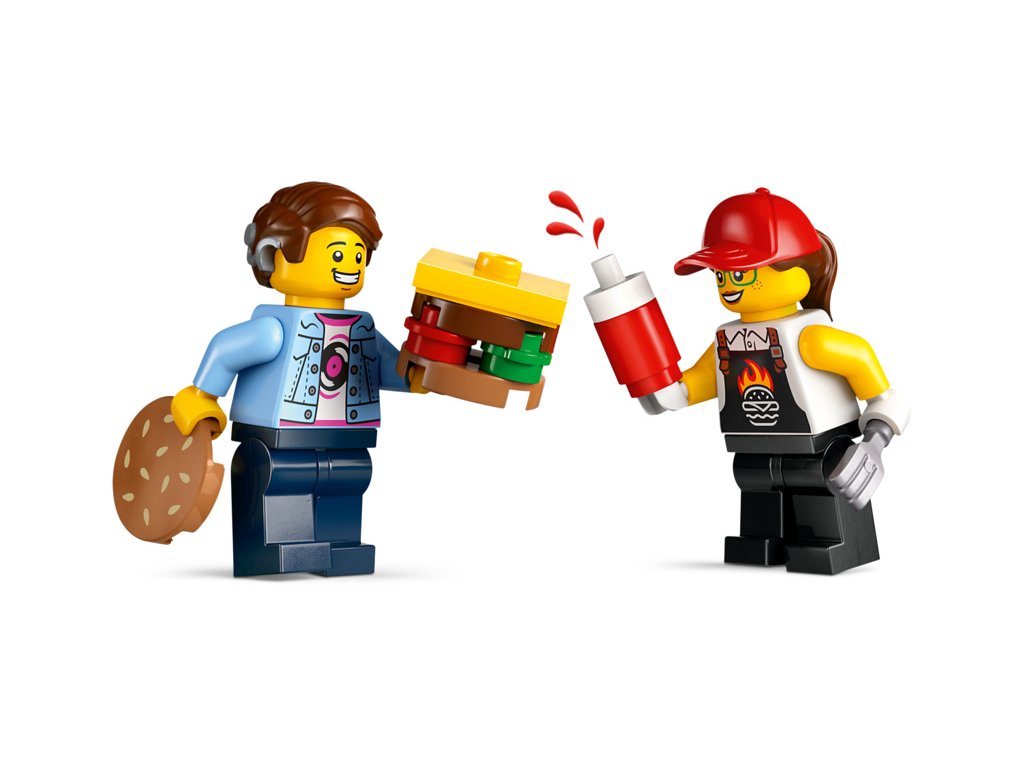 - Co najdete v krabici? – Součástí je vše, co děti potřebují k sestavení modelu hamburgerového trucku, minifigurka prodejce a zákazníka s naslouchátkem a řada doplňků LEGO® v podobě omáček a dochucovadel