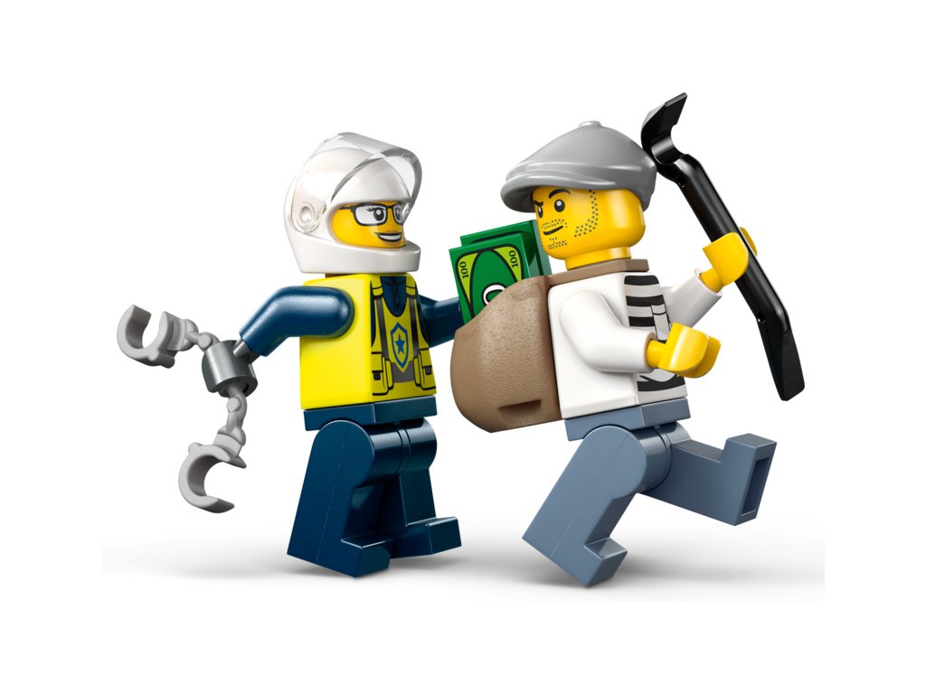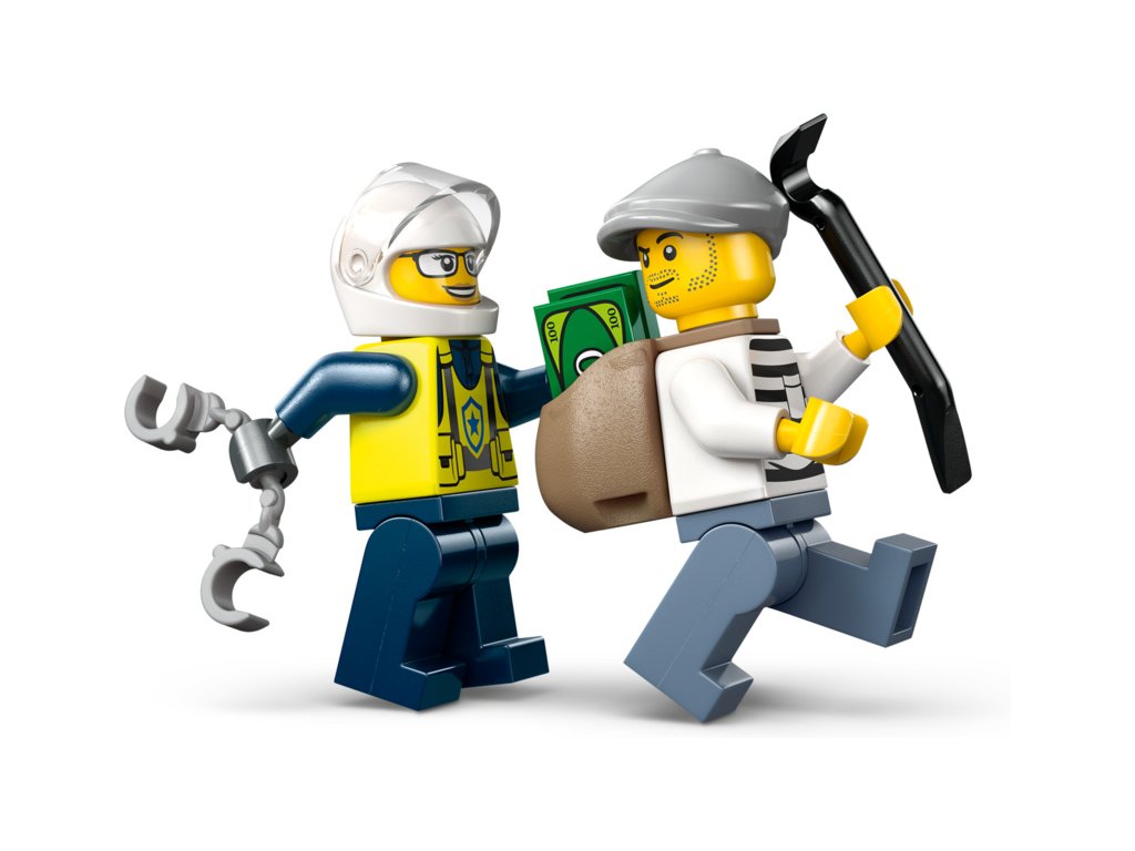 - Zábavné doplňky – Tato policejní stavebnice obsahuje doplňky pro minifigurky LEGO®, včetně bankovky, plakátu hledaného zločince, baterky, pout a páčidla