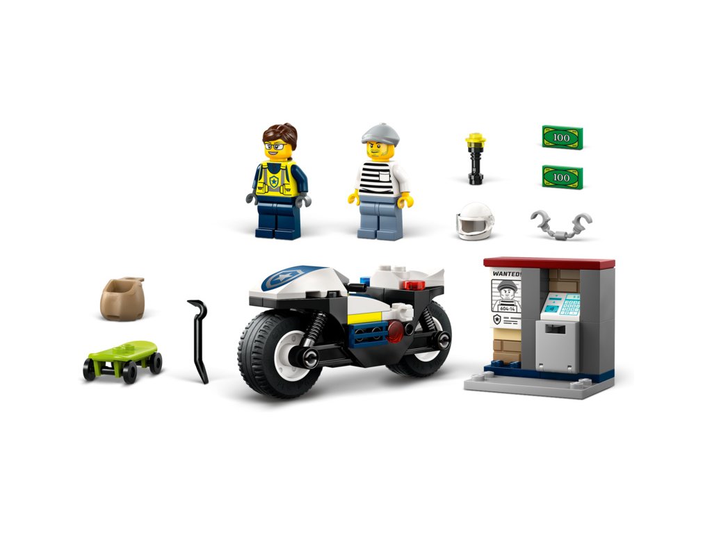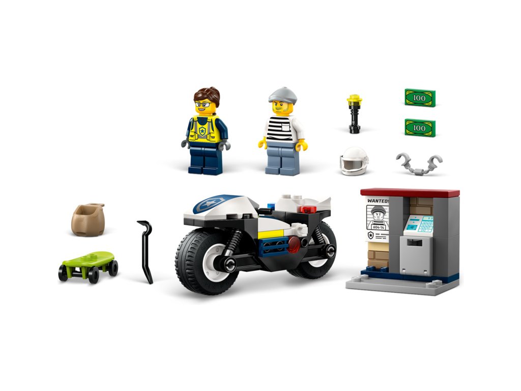 - Co najdete v krabici? – Vše, co děti potřebují k sestavení policejní motorky, skateboardu a bankomatu a minifigurku policisty a skateboardisty pro hraní na postavy