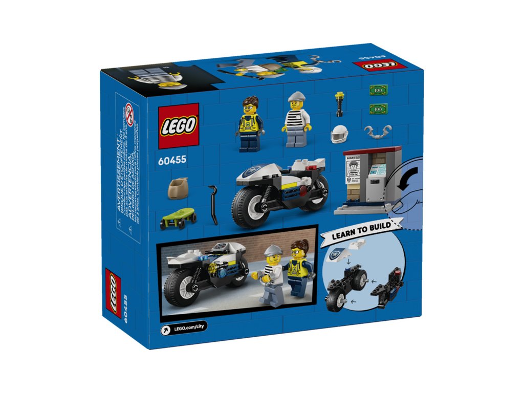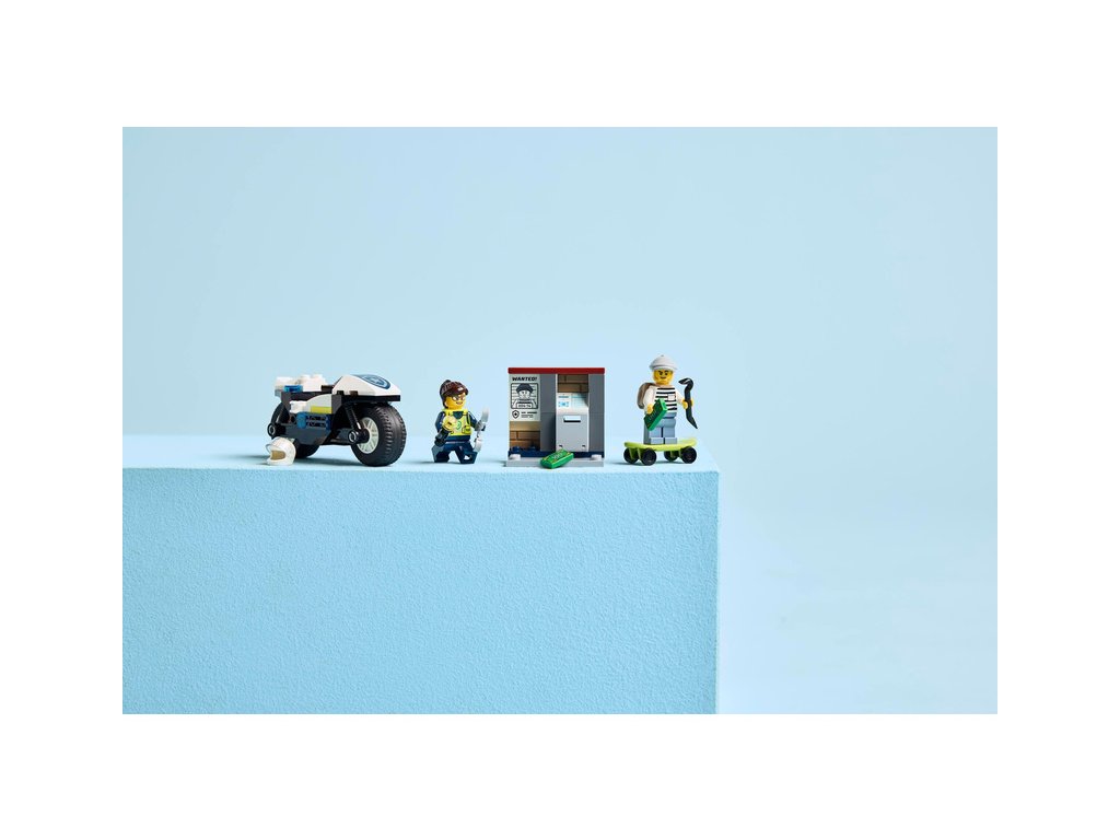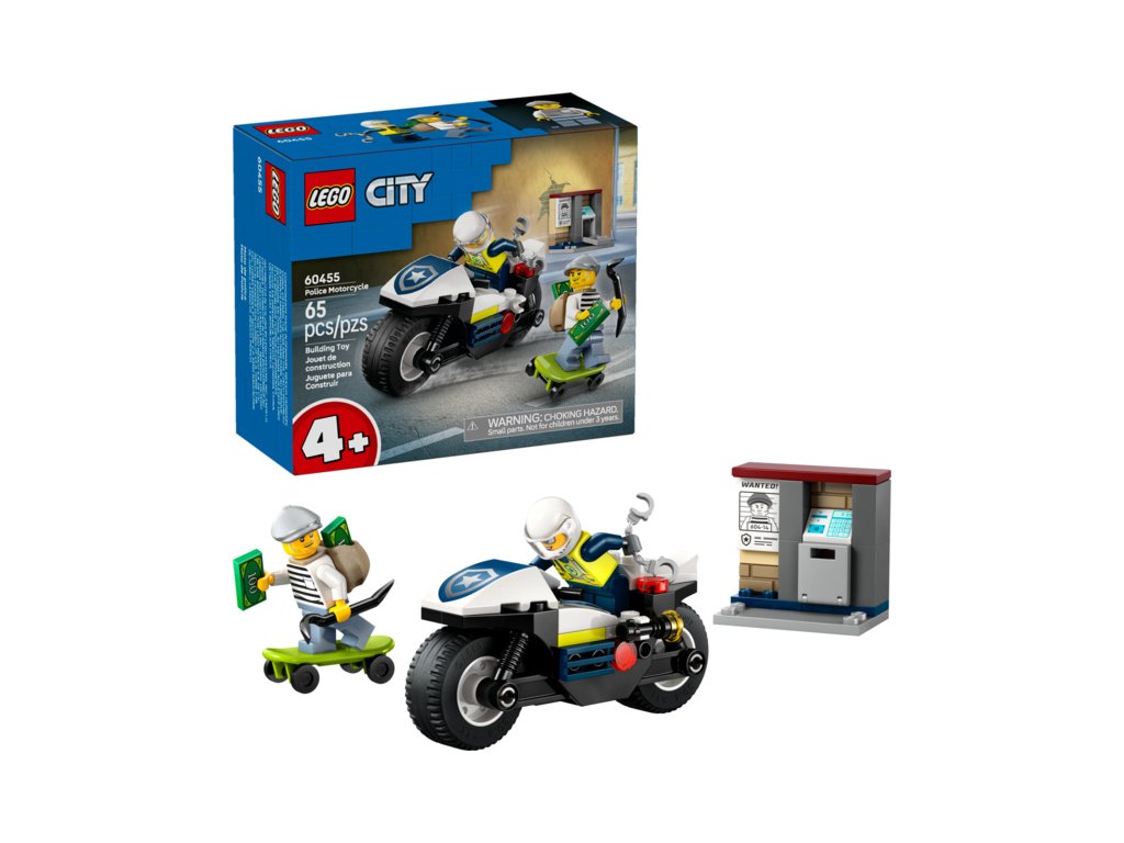 Překvapte svého mladého akčního hrdinu touto vzrušující stavebnicí Policejní honička na motorce (60455) od LEGO® City. Je ideální pro malé stavitele od 4 let a nabízí parádní policejní motorku se širokými pneumatikami, zlodějův skateboard a otevírací minibankomat s bankovkou. Stačí přidat minifigurky policisty a zloděje a můžete si užít hodiny nápaditého hraní a vyprávění příběhů.